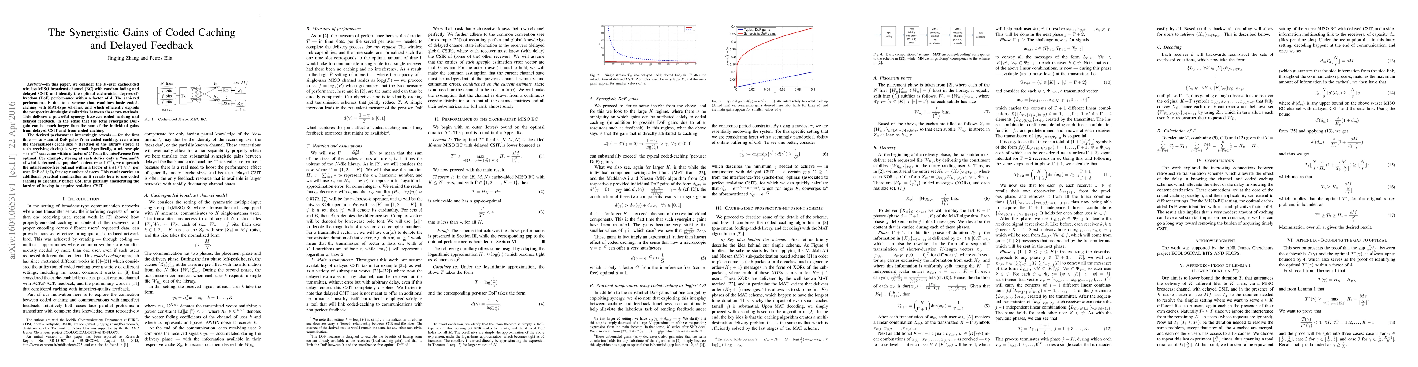 In this paper, we consider the $K$-user cache-aided wireless MISO broadcast channel (BC) with random fading and delayed CSIT, and identify the optimal cache-aided degrees-of-freedom (DoF) performance within a factor of 4. The achieved performance is due to a scheme that combines basic coded-caching with MAT-type schemes, and which efficiently exploits the prospective-hindsight similarities between these two methods. This delivers a powerful synergy between coded caching and delayed feedback, in the sense that the total synergistic DoF-gain can be much larger than the sum of the individual gains from delayed CSIT and from coded caching. The derived performance interestingly reveals --- for the first time --- substantial DoF gains from coded caching, even when the (normalized) cache size $\gamma$ (fraction of the library stored at each receiving device) is very small. Specifically, a microscopic $\gamma \approx e^{-G}$ can come within a factor of $G$ from the interference-free optimal. For example, storing at each device only a \emph{thousandth} of what is deemed as `popular' content ($\gamma\approx 10^{-3}$), we approach the interference-free optimal within a factor of $ln(10^3) \approx 7$ (per user DoF of $1/7$), for any number of users. This result carries an additional practical ramification as it reveals how to use coded caching to essentially buffer CSI, thus partially ameliorating the burden of having to acquire real-time CSIT.