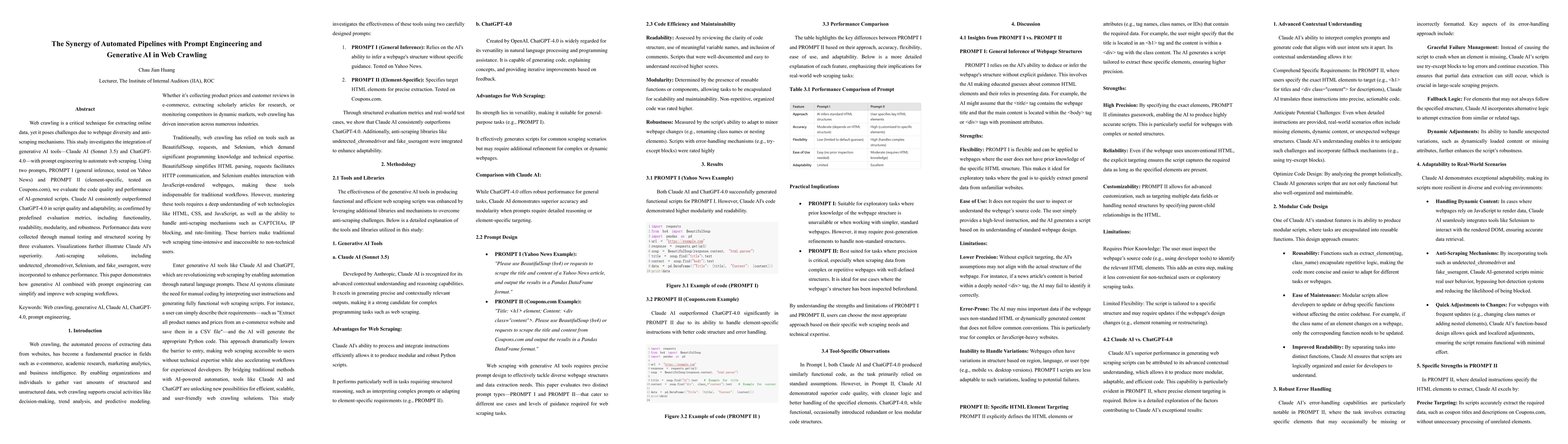 Summary: This research explores the use of generative AI tools, specifically Claude AI and ChatGPT4.0, in automating web scraping through prompt engineering. Results show that Claude AI produced superior script quality and adaptability compared to ChatGPT4.0, as evidenced by predefined metrics and evaluations. The study highlights the potential of generative AI to enhance web crawling efficiency and effectiveness.