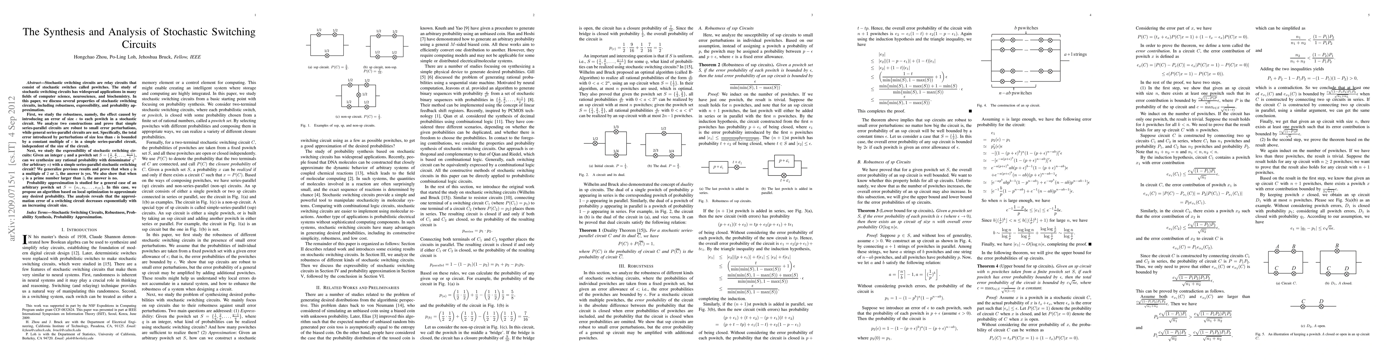 This paper investigates the properties of stochastic switching circuits, focusing on robustness, expressibility, and probability approximation. It finds that simple series-parallel circuits are robust to small error perturbations, while general series-parallel circuits are not. The study also proves that simple series-parallel circuits can synthesize rational probabilities when the denominator is a multiple of 2 or 3, but not when it is a prime larger than 3. Lastly, an algorithm for probability approximation shows that error decreases exponentially with circuit size.