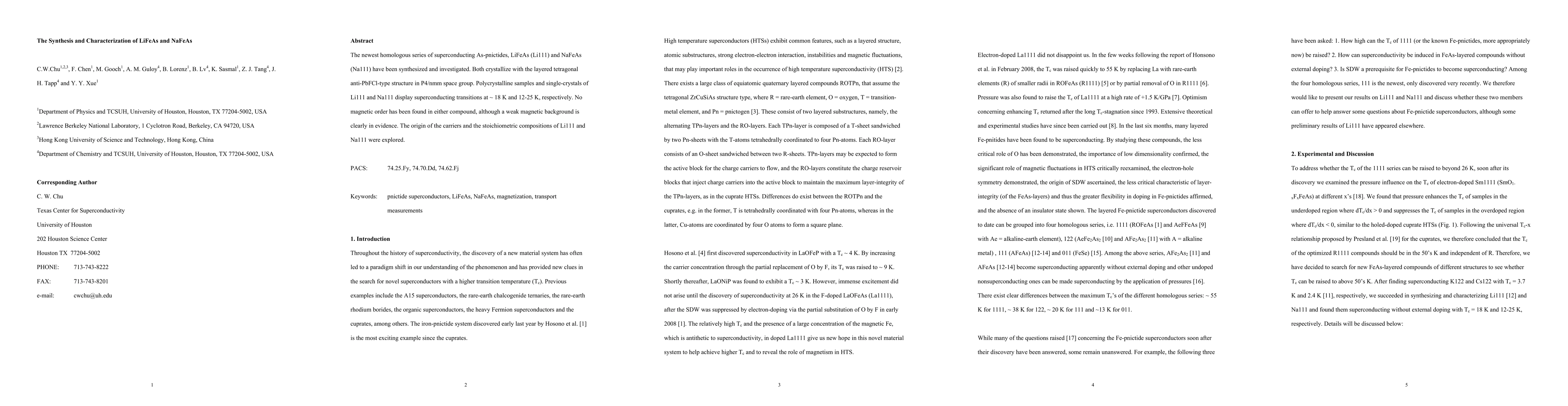 Summary: This paper synthesizes and characterizes the superconducting pnictides LiFeAs and NaFeAs, which crystallize in a layered tetragonal structure. Both exhibit superconductivity at ~18 K and 12-25 K, respectively, with no detected magnetic order, though a weak magnetic background is present.