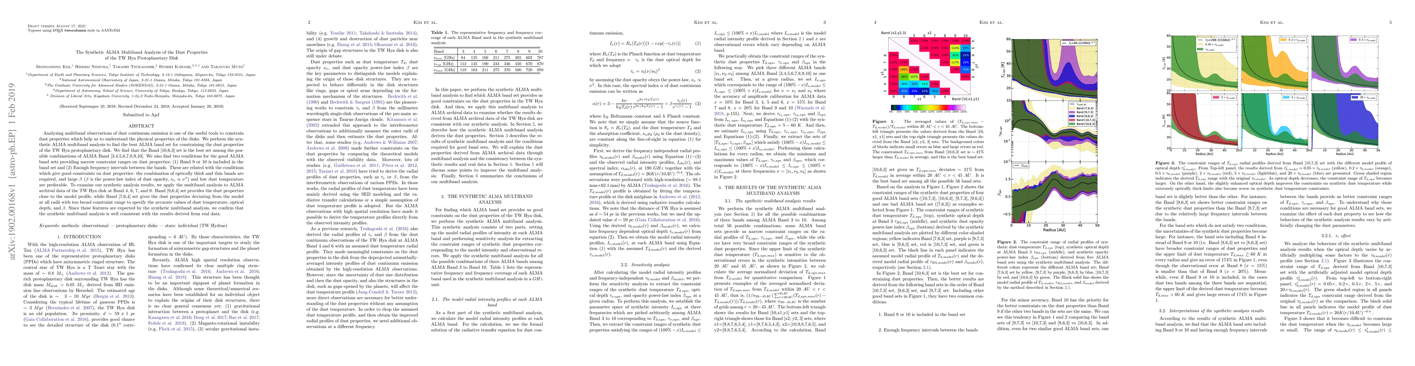 This study uses synthetic ALMA multiband analysis to determine the optimal band set for constraining dust properties in the TW Hya protoplanetary disk. The best band set identified is Band [10,6,3], with conditions including the inclusion of Band 9 or 10 and sufficient frequency intervals between bands for accurate dust property constraints.