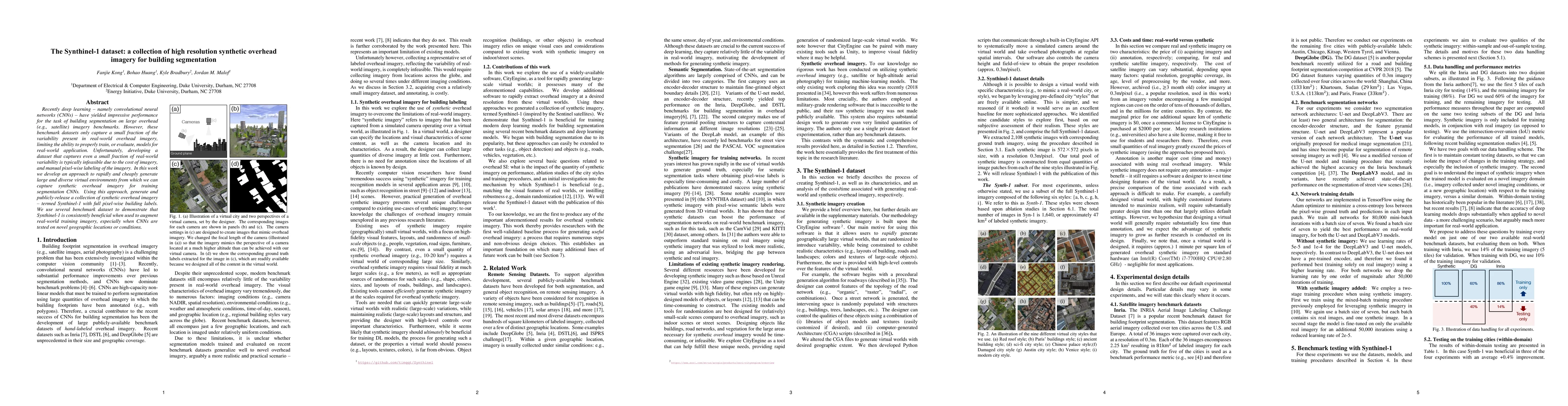 The Synthinel-1 dataset provides high-resolution synthetic overhead imagery for building segmentation, generated from virtual environments to augment real-world training data. Experiments show it enhances CNN performance, especially in novel geographic conditions.