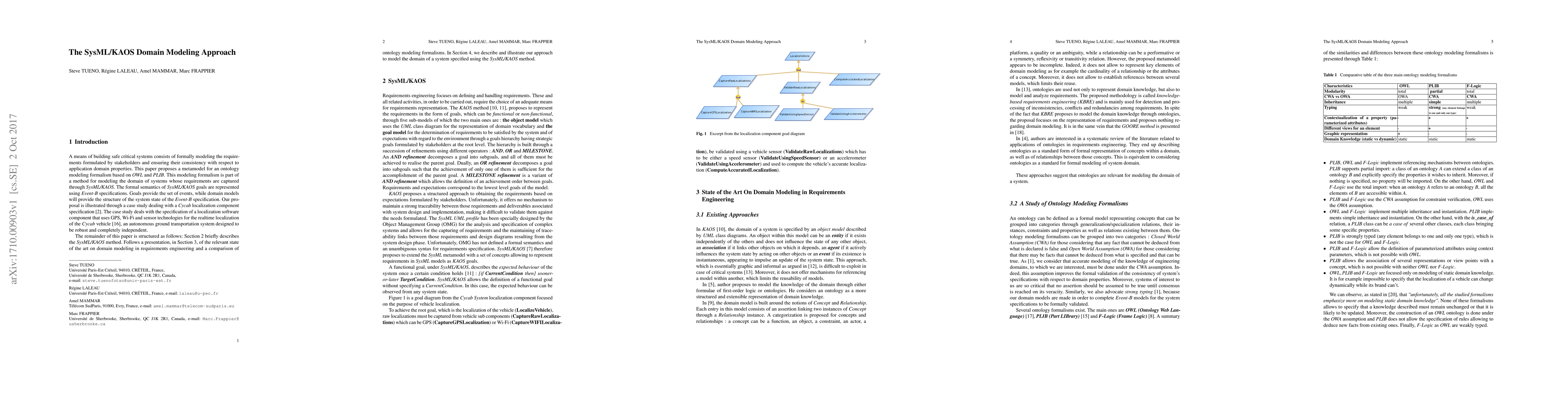 The paper proposes a metamodel for ontology modeling based on OWL and PLIB, representing formal semantics of SysML/KAOS goals using Event-B specifications. It illustrates the approach through a Cycab localization component specification.
