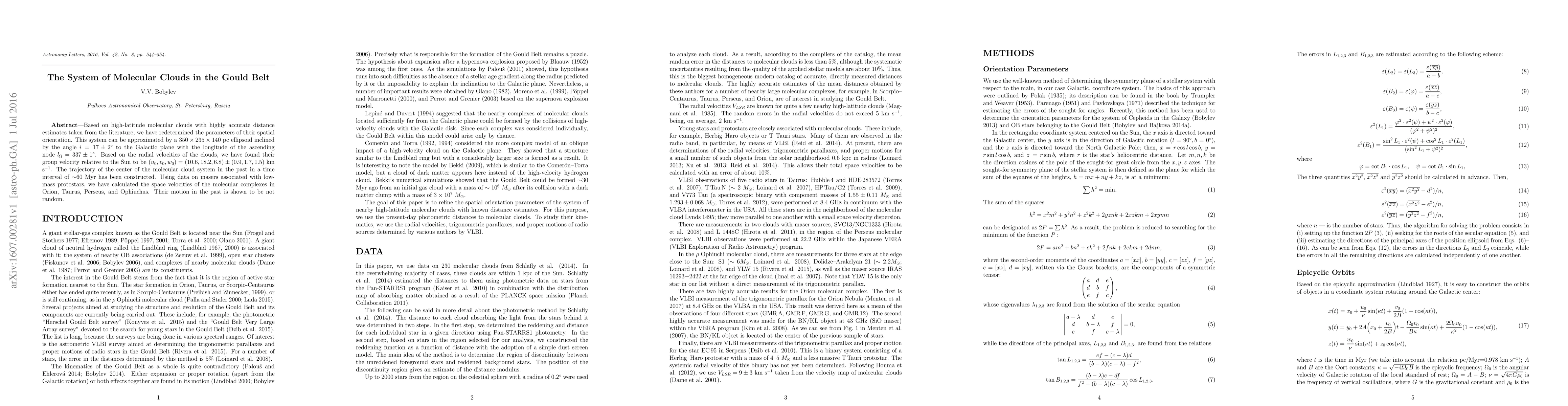 Based on high-latitude molecular clouds with highly accurate distance estimates taken from the literature, we have redetermined the parameters of their spatial orientation. This system can be approximated by a 350x235x140 pc ellipsoid inclined by the angle i=17+/-2 degrees to the Galactic plane with the longitude of the ascending node l{\Omega}=337+/-1 degrees. Based on the radial velocities of the clouds, we have found their group velocity relative to the Sun to be (u0,v0,w0) = (10.6,18.2,6.8)+/-(0.9,1.7,1.5) km/s. The trajectory of the center of the molecular cloud system in the past in a time interval of ~60 Myr has been constructed. Using data on masers associated with low-mass protostars, we have calculated the space velocities of the molecular complexes in Orion, Taurus, Perseus, and Ophiuchus. Their motion in the past is shown to be not random.