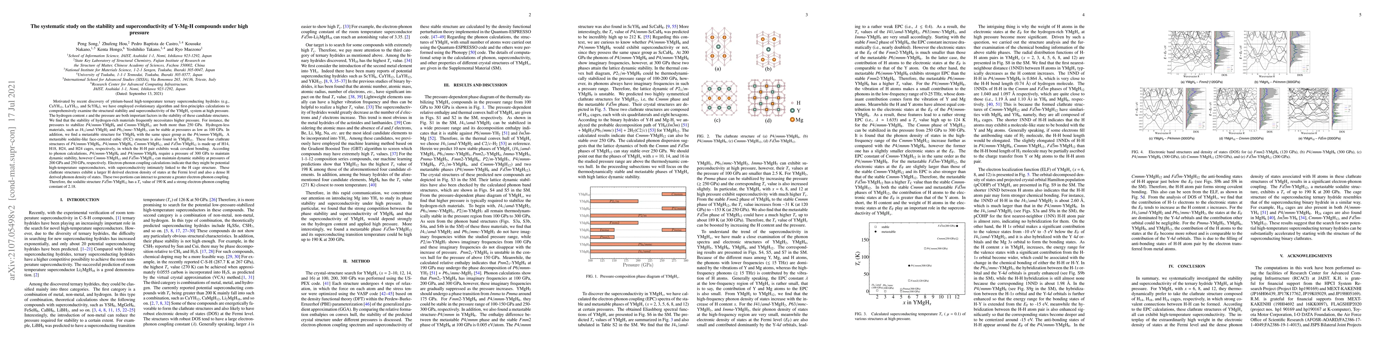 This research systematically studies Y-Mg-H compounds' stability and superconductivity under high pressure using evolutionary algorithms and first-principles calculations. Key findings include identifying stable hydrogen-rich materials needing high pressure (e.g., >250 GPa for YMgH8 and YMgH12), hydrogen-less materials stable at lower pressures (e.g., 100 GPa for YMgH2 and YMgH3), and metastable structures like YMgH6 and YMgH12. Phonon calculations suggest these structures could be high-temperature superconductors, with YMgH12 exhibiting a critical temperature (Tc) of 190K.