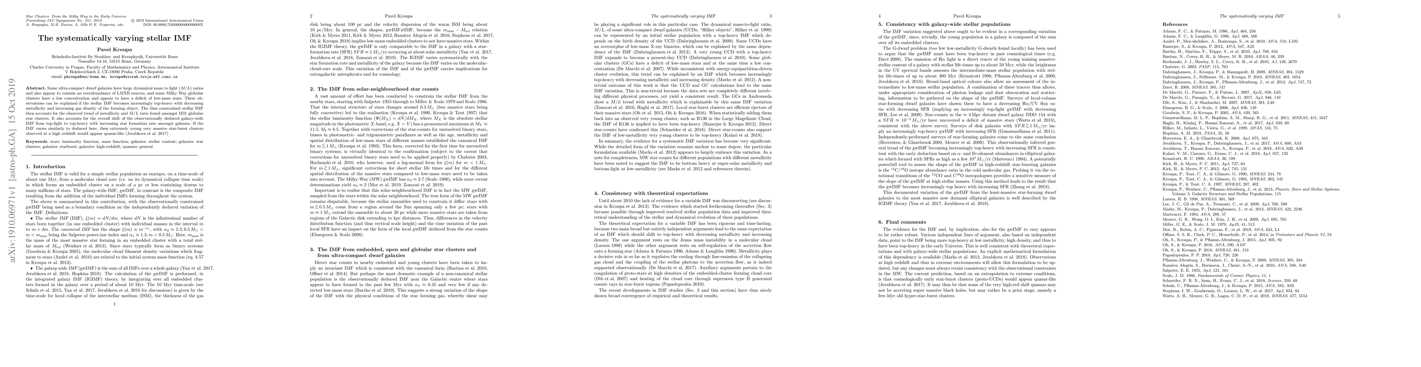 Some ultra-compact dwarf galaxies have large dynamical mass to light (M/L) ratios and also appear to contain an overabundance of LMXB sources, and some Milky Way globular clusters have a low concentration and appear to have a deficit of low-mass stars. These observations can be explained if the stellar IMF becomes increasingly top-heavy with decreasing metallicity and increasing gas density of the forming object. The thus constrained stellar IMF then accounts for the observed trend of metallicity and M/L ratio found amongst M31 globular star clusters. It also accounts for the overall shift of the observationally deduced galaxy-wide IMF from top-light to top-heavy with increasing star formation rate amongst galaxies. If the IMF varies similarly to deduced here, then extremely young very massive star-burst clusters observed at a high redshift would appear quasar-like (Jerabkova et al. 2017) .