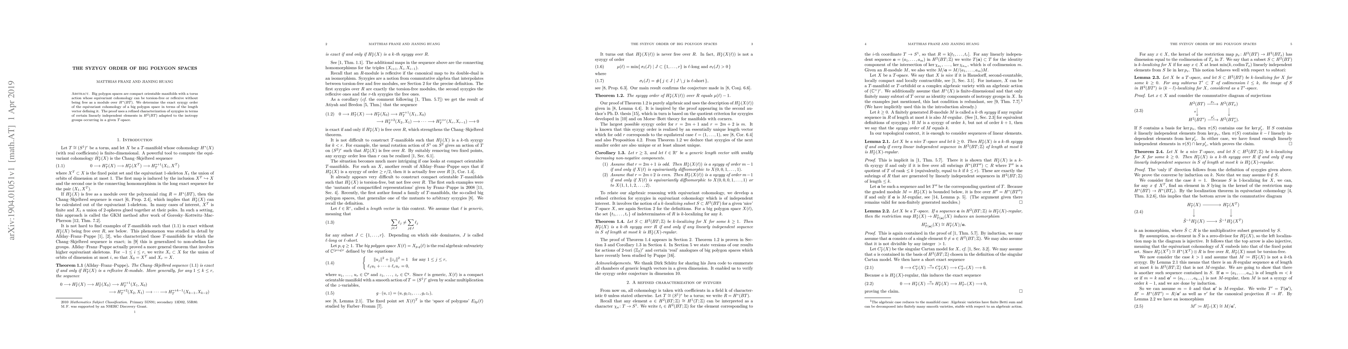 Big polygon spaces are compact orientable manifolds with a torus action whose equivariant cohomology can be torsion-free or reflexive without being free as a module over $H^*(BT)$. We determine the exact syzygy order of the equivariant cohomology of a big polygon space in terms of the length vector defining it. The proof uses a refined characterization of syzygies in terms of certain linearly independent elements in $H^2(BT)$ adapted to the isotropy groups occurring in a given $T$-space.