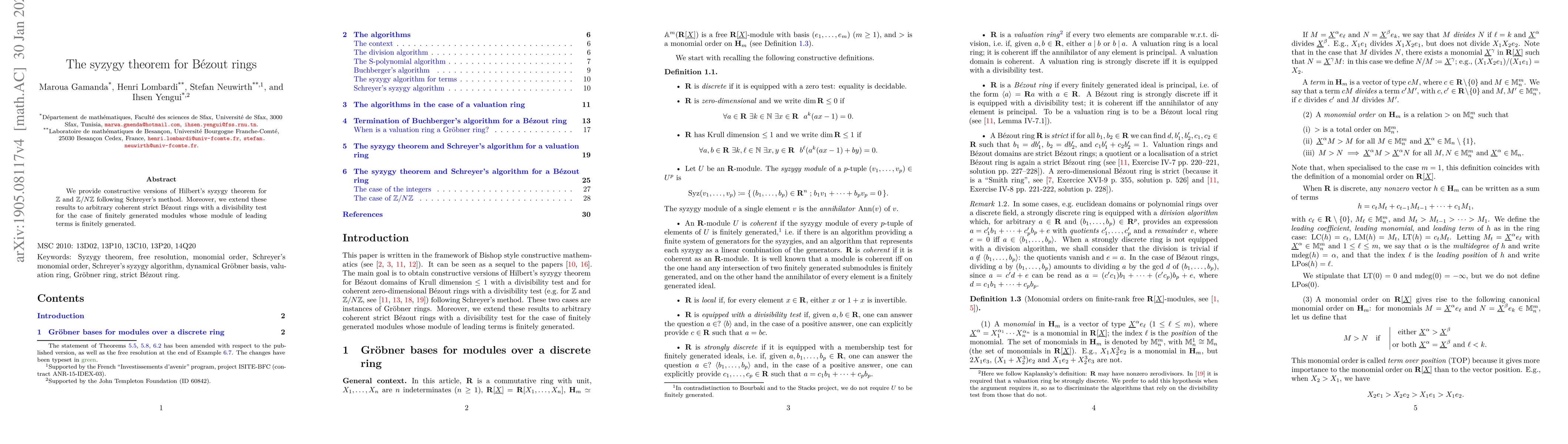 The paper presents constructive versions of Hilbert's syzygy theorem for integer rings and their finite quotients, extending Schreyer's method, and applies these results to coherent strict B\'ezout rings for finitely generated modules with finitely generated module of leading terms.