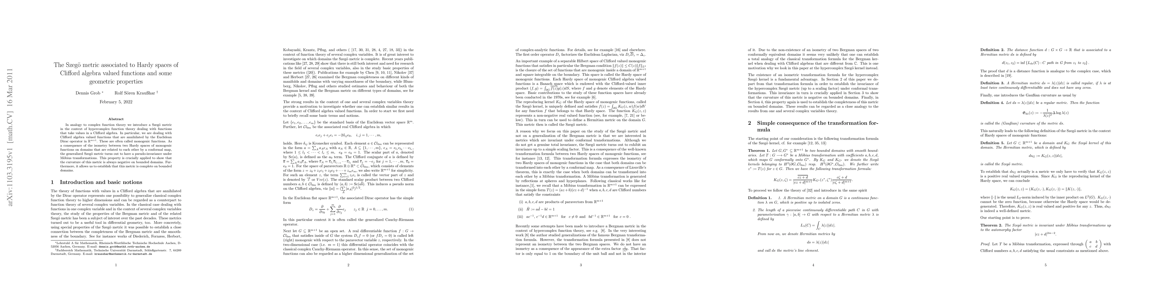 This paper introduces a Szegő metric for Clifford algebra valued Hardy spaces, demonstrating pseudo-invariance under Möbius transformations and proving the metric's negativity of curvature and completeness on bounded domains.