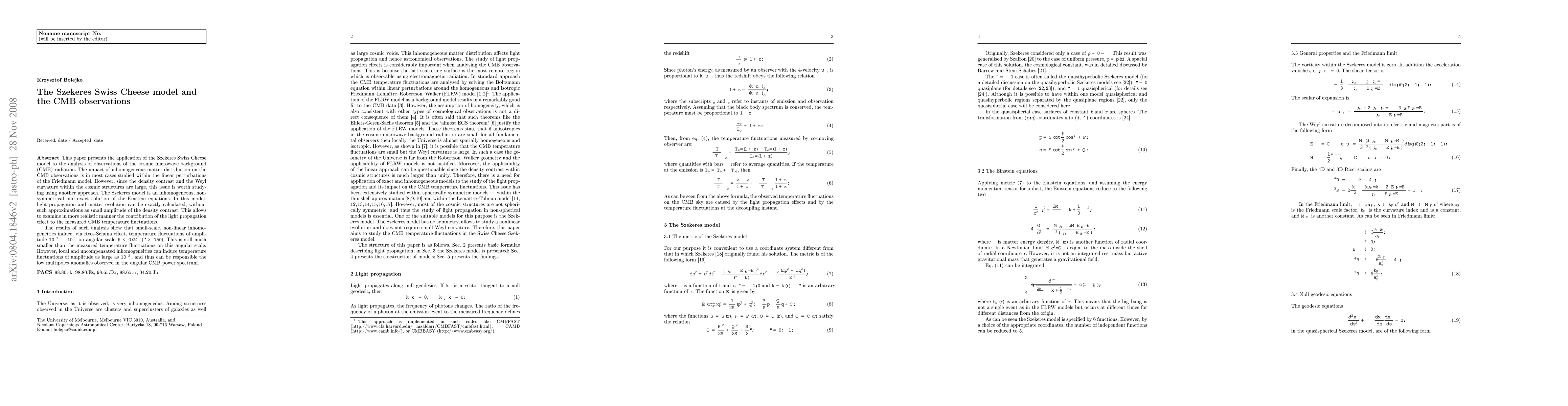 This paper applies the Szekeres Swiss Cheese model to analyze CMB observations, revealing that small-scale, non-linear inhomogeneities induce temperature fluctuations of $10^{-7} - 10^{-5}$ on angular scales smaller than $0.24^{\circ}$. Local inhomogeneities can cause larger fluctuations, potentially explaining low multipole anomalies in the CMB power spectrum.