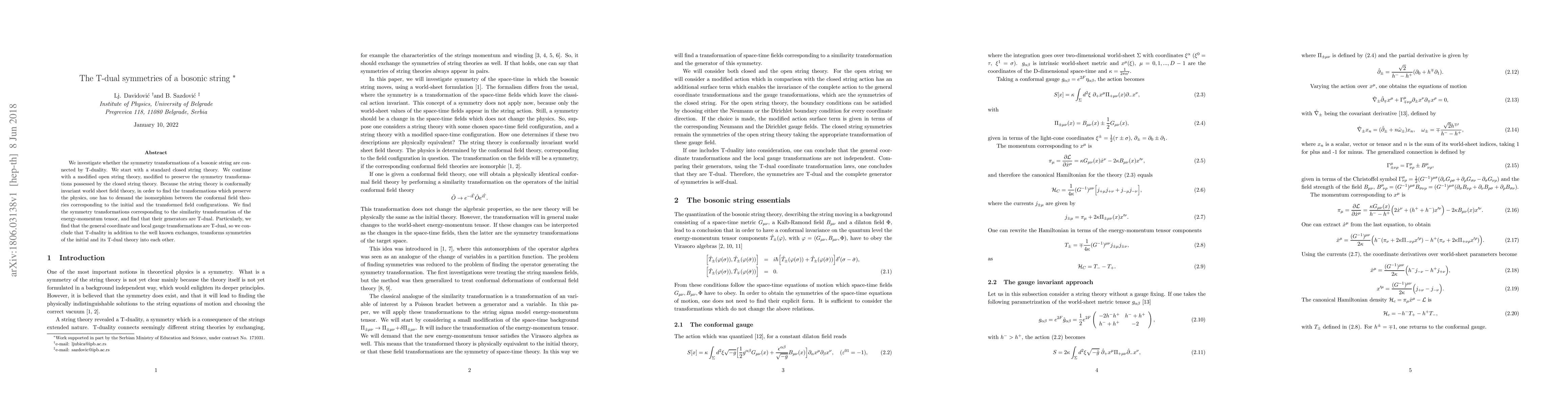 We investigate whether the symmetry transformations of a bosonic string are connected by T-duality. We start with a standard closed string theory. We continue with a modified open string theory, modified to preserve the symmetry transformations possessed by the closed string theory. Because the string theory is conformally invariant world sheet field theory, in order to find the transformations which preserve the physics, one has to demand the isomorphism between the conformal field theories corresponding to the initial and the transformed field configurations. We find the symmetry transformations corresponding to the similarity transformation of the energy-momentum tensor, and find that their generators are T-dual. Particularly, we find that the general coordinate and local gauge transformations are T-dual, so we conclude that T-duality in addition to the well known exchanges, transforms symmetries of the initial and its T-dual theory into each other.