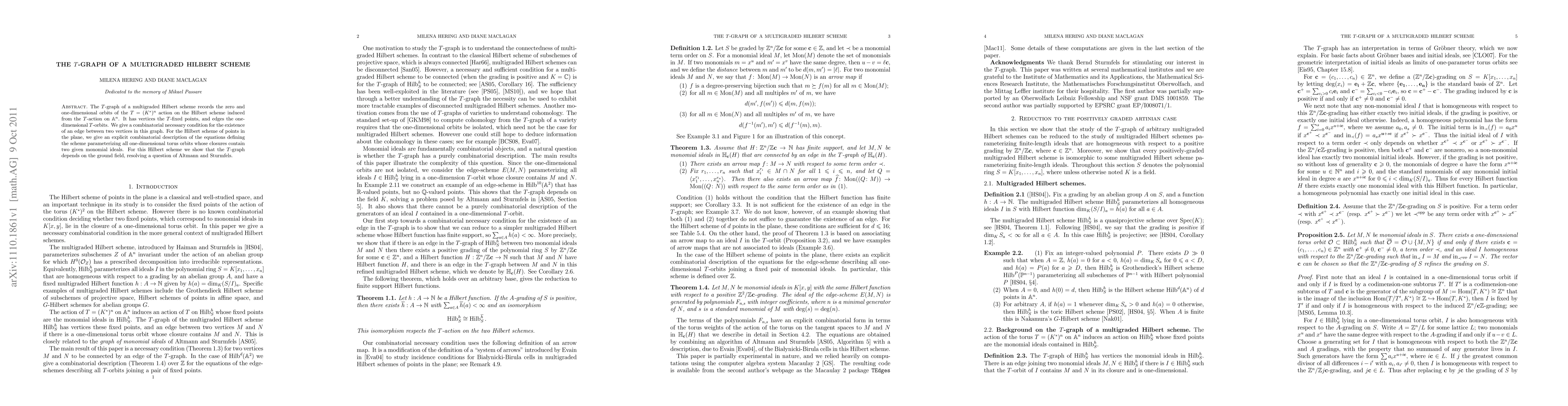 The paper studies the T-graph of a multigraded Hilbert scheme, which encodes information about one-dimensional orbits under the action of the torus group, and finds a combinatorial necessary condition for edge existence and an explicit description for specific cases.
