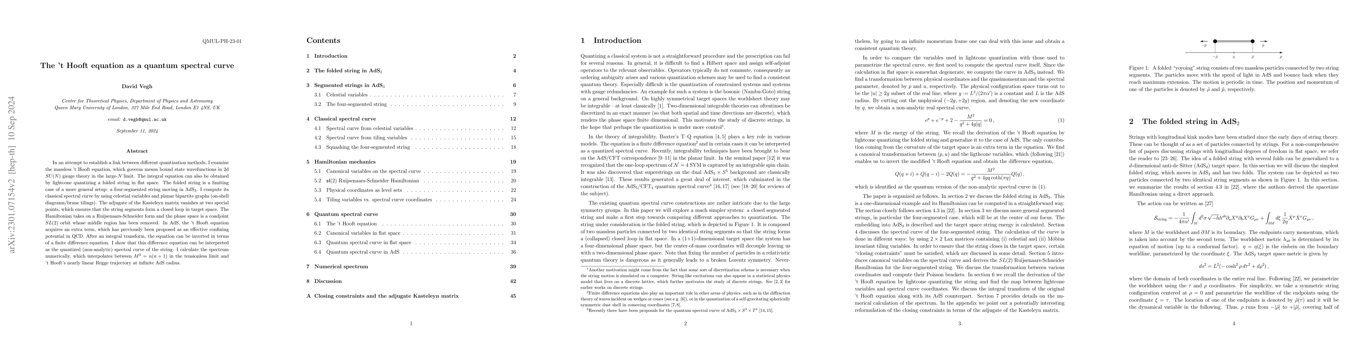 In an attempt to establish a link between different quantization methods, I examine the massless 't Hooft equation, which governs meson bound state wavefunctions in 2d SU(N) gauge theory in the large-N limit. The integral equation can also be obtained by lightcone quantizing a folded string in flat space. The folded string is a limiting case of a more general setup: a four-segmented string moving in AdS$_3$. I compute its classical spectral curve by using celestial variables and planar bipartite graphs (on-shell diagrams/brane tilings). The adjugate of the Kasteleyn matrix vanishes at two special points, which ensures that the string segments form a closed loop in target space. The Hamiltonian takes on a Ruijsenaars-Schneider form and the phase space is a coadjoint SL(2) orbit whose middle region has been removed. In AdS, the 't Hooft equation acquires an extra term, which has previously been proposed as an effective confining potential in QCD. After an integral transform, the equation can be inverted in terms of a finite difference equation. I show that this difference equation can be interpreted as the quantized (non-analytic) spectral curve of the string. I calculate the spectrum numerically, which interpolates between $\Delta^2=n(n+1)$ in the tensionless limit and 't Hooft's nearly linear Regge trajectory at infinite AdS radius.