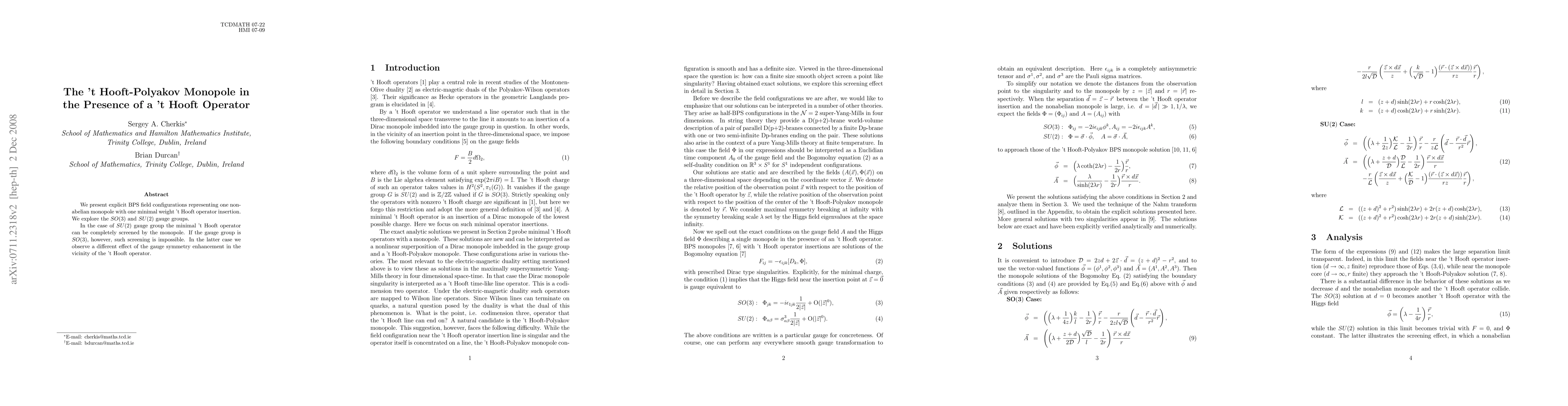 This paper presents BPS field configurations for nonabelian monopoles with 't Hooft operator insertions, focusing on SO(3) and SU(2) gauge groups. In SU(2), the monopole can screen the minimal 't Hooft operator, while in SO(3), screening is impossible, leading to gauge symmetry enhancement near the operator.