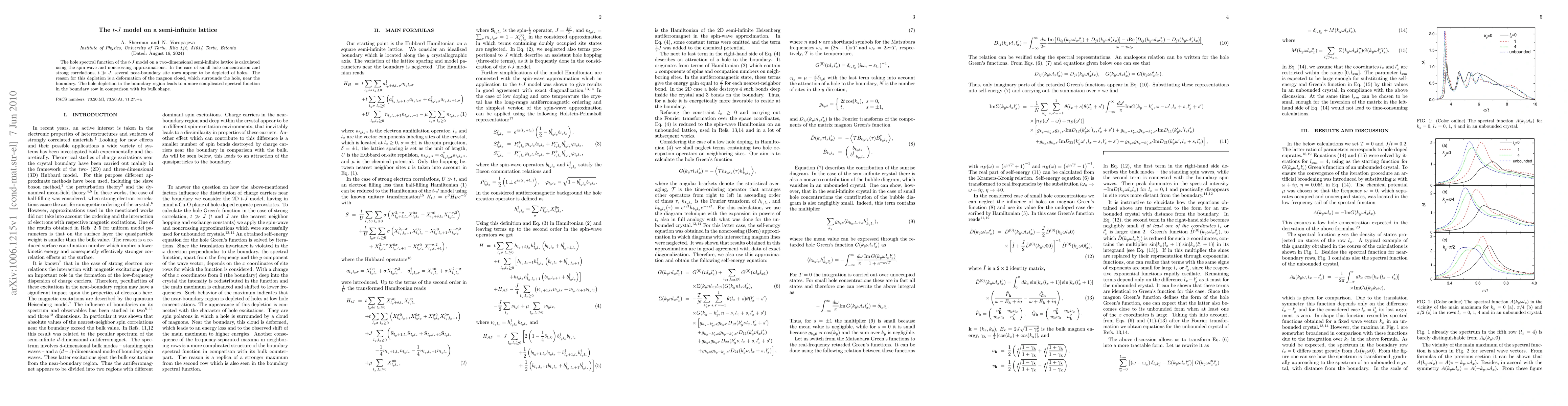 The t-J model on a semi-infinite lattice shows hole depletion in near-boundary rows due to a deformed magnon cloud, leading to a more complex spectral function compared to the bulk. This effect is pronounced at small hole concentrations and strong correlations.