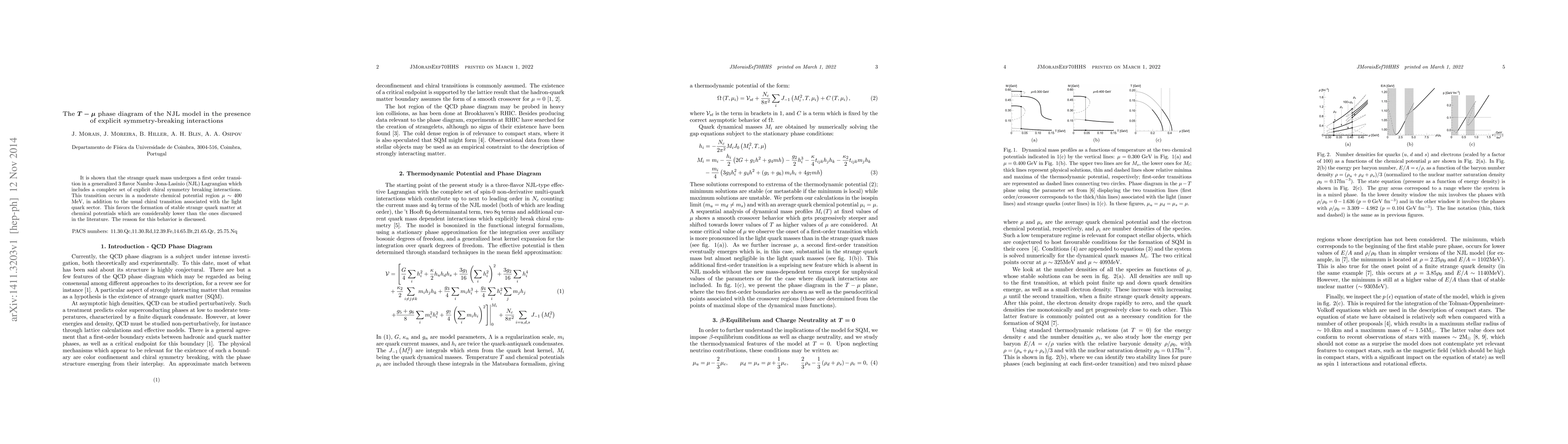 It is shown that the strange quark mass undergoes a first order transition in a generalized 3 flavor Nambu--Jona-Lasinio (NJL) Lagrangian which includes a complete set of explicit chiral symmetry breaking interactions. This transition occurs in a moderate chemical potential region $\mu \sim 400$ MeV, in addition to the usual chiral transition associated with the light quark sector. This favors the formation of stable strange quark matter at chemical potentials which are considerably lower than the ones discussed in the literature. The reason for this behavior is discussed.