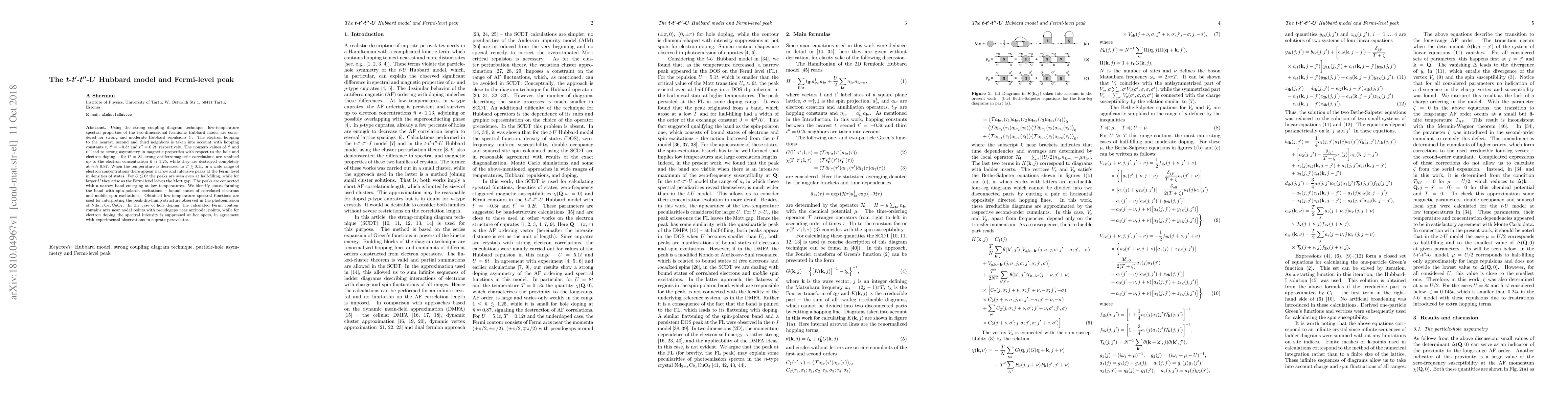 Using the strong coupling diagram technique, low-temperature spectral properties of the two-dimensional fermionic Hubbard model are con\-si\-de\-red for strong and moderate Hubbard repulsions $U$. The electron hopping to the nearest, second and third neighbors is taken into account with hopping constants $t$, $t'=-0.3t$ and $t''=0.2t$, respectively. The nonzero values of $t'$ and $t''$ lead to strong asymmetry in magnetic properties with respect to the hole and electron doping -- for $U=8t$ strong antiferromagnetic correlations are retained up to the electron concentration $\bar{n}\approx 1.25$, while they are destroyed completely at $\bar{n}\approx 0.87$. When the temperature is decreased to $T\lesssim 0.1t$, in a wide range of electron concentrations there appear narrow and intensive peaks at the Fermi level in densities of states. For $U\lesssim 6t$ the peaks are seen even at half-filling, while for larger $U$ they arise as the Fermi level leaves the Mott gap. The peaks are connected with a narrow band emerging at low temperatures. We identify states forming the band with spin-polaron excitations -- bound states of correlated electrons and mobile spin excitations. Obtained low-temperature spectral functions are used for interpreting the peak-dip-hump structure observed in the photoemission of Nd$_{2-x}$Ce$_x$CuO$_4$. In the case of hole doping, the calculated Fermi contour contains arcs near nodal points with pseudogaps near antinodal points, while for electron doping the spectral intensity is suppressed at hot spots, in agreement with experimental observations in cuprate perovskites.