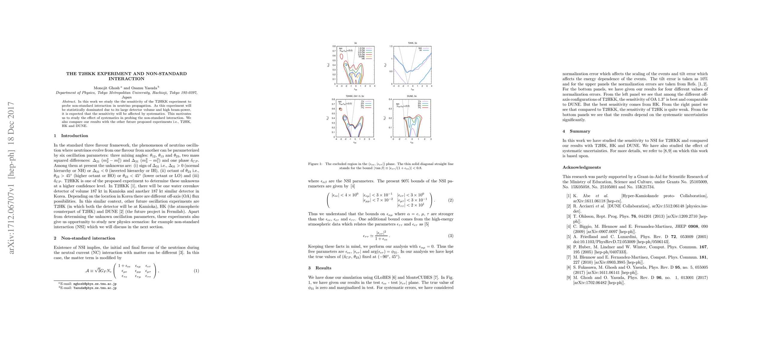 The T2HKK experiment aims to investigate non-standard interactions in neutrino propagation, leveraging its large detector volume and high beam power. The study assesses the impact of systematic uncertainties on this sensitivity and compares its potential with other future neutrino experiments like T2HK, HK, and DUNE.