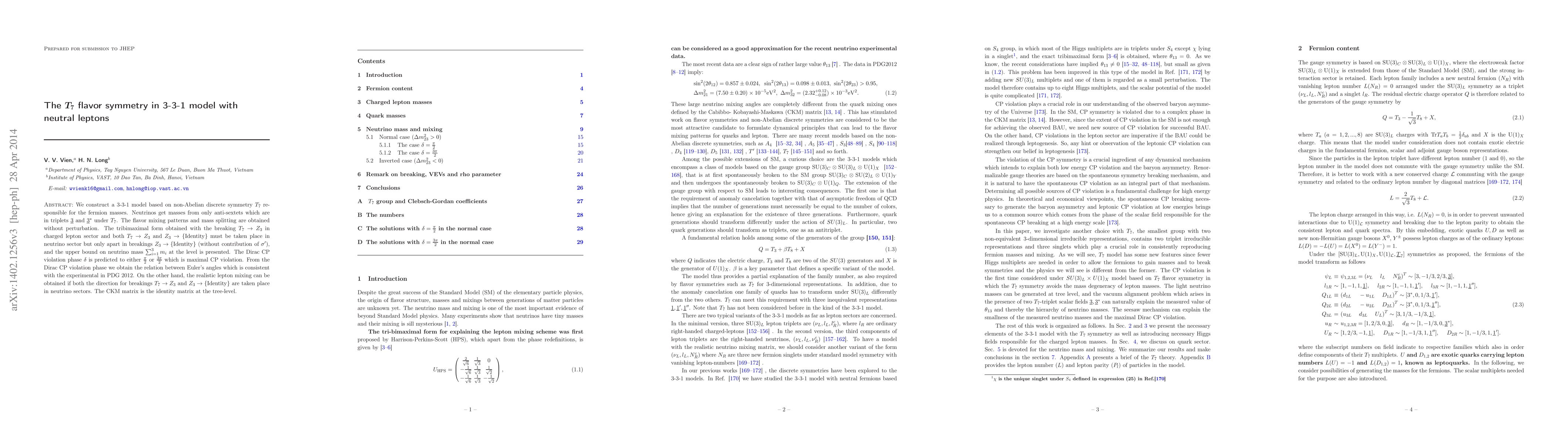 We construct a 3-3-1 model based on non-Abelian discrete symmetry $T_7$ responsible for the fermion masses. Neutrinos get masses from only anti-sextets which are in triplets $\underline{3}$ and $\underline{3}^*$ under $T_7$. The flavor mixing patterns and mass splitting are obtained without perturbation. The tribimaximal form obtained with the breaking $T_7 \rightarrow Z_3$ in charged lepton sector and both $T_7 \rightarrow Z_3$ and $Z_3 \rightarrow \{\mathrm{Identity}\}$ must be taken place in neutrino sector but only apart in breakings $Z_3 \rightarrow \{\mathrm{Identity}\}$ (without contribution of $\si'$), and the upper bound on neutrino mass $\sum_{i=1}^3m_i$ at the level is presented. The Dirac CP violation phase $\delta$ is predicted to either $\frac{\pi}{2}$ or $\frac{3\pi}{2}$ which is maximal CP violation. From the Dirac CP violation phase we obtain the relation between Euler's angles which is consistent with the experimental in PDG 2012. On the other hand, the realistic lepton mixing can be obtained if both the direction for breakings $T_7 \rightarrow Z_3$ and $Z_3 \rightarrow \{\mathrm{Identity}\}$ are taken place in neutrino sectors. The CKM matrix is the identity matrix at the tree-level.