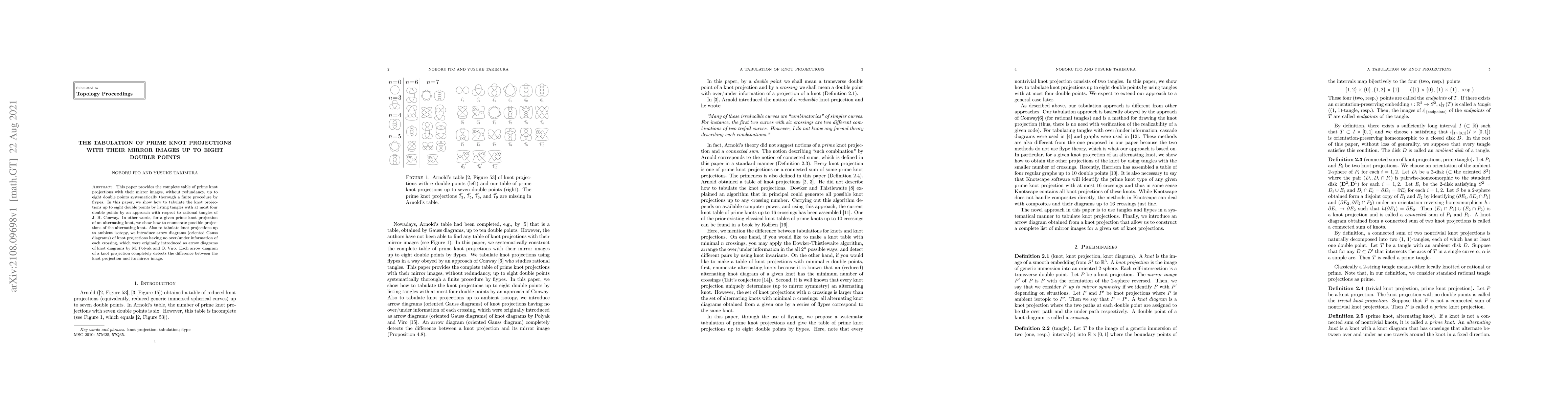 This paper provides the complete table of prime knot projections with their mirror images, without redundancy, up to eight double points systematically thorough a finite procedure by flypes. In this paper, we show how to tabulate the knot projections up to eight double points by listing tangles with at most four double points by an approach with respect to rational tangles of J. H. Conway. In other words, for a given prime knot projection of an alternating knot, we show how to enumerate possible projections of the alternating knot. Also to tabulate knot projections up to ambient isotopy, we introduce arrow diagrams (oriented Gauss diagrams) of knot projections having no over/under information of each crossing, which were originally introduced as arrow diagrams of knot diagrams by M. Polyak and O. Viro. Each arrow diagram of a knot projection completely detects the difference between the knot projection and its mirror image.