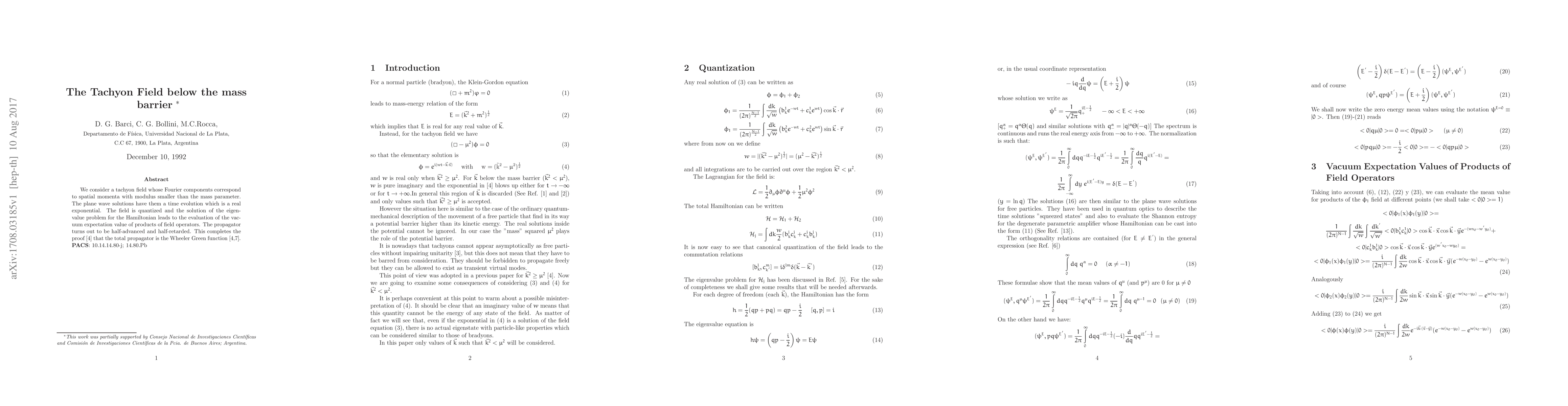 We consider a tachyon field whose Fourier components correspond to spatial momenta with modulus smaller than the mass parameter. The plane wave solutions have them a time evolution which is a real exponential. The field is quantized and the solution of the eigenvalue problem for the Hamiltonian leads to the evaluation of the vacuum expectation value of products of field operators. The propagator turns out to be half-advanced and half-retarded. This completes the proof [4] that the total propagator is the Wheeler Green function [4,7].