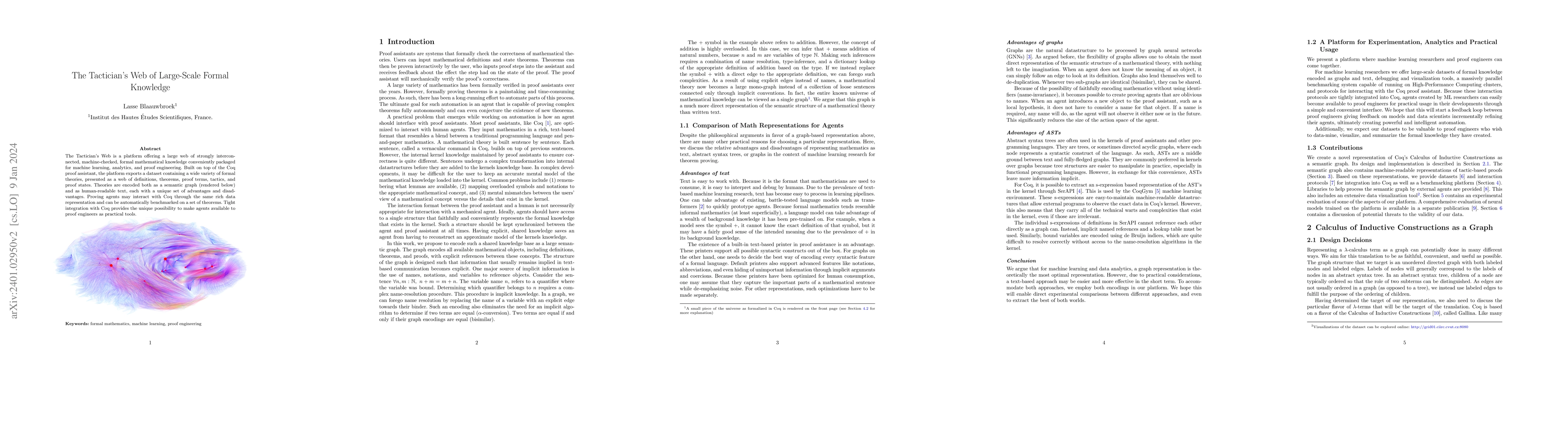 The Tactician's Web is a platform offering a large web of strongly interconnected, machine-checked, formal mathematical knowledge conveniently packaged for machine learning, analytics, and proof engineering. Built on top of the Coq proof assistant, the platform exports a dataset containing a wide variety of formal theories, presented as a web of definitions, theorems, proof terms, tactics, and proof states. Theories are encoded both as a semantic graph (rendered below) and as human-readable text, each with a unique set of advantages and disadvantages. Proving agents may interact with Coq through the same rich data representation and can be automatically benchmarked on a set of theorems. Tight integration with Coq provides the unique possibility to make agents available to proof engineers as practical tools.