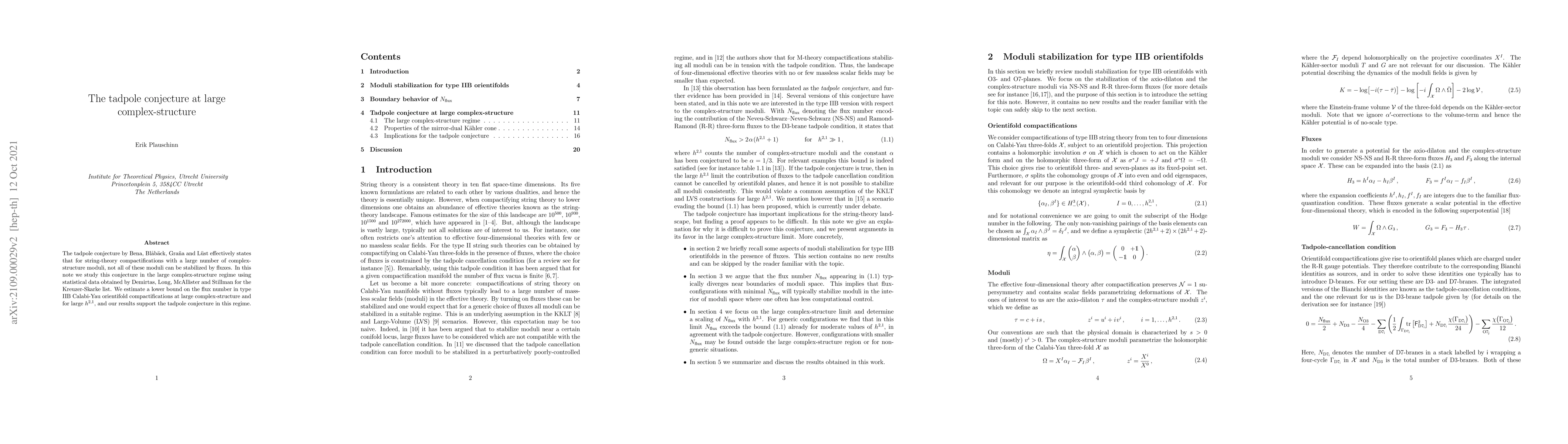 The tadpole conjecture posits that not all complex-structure moduli in string-theory compactifications can be stabilized by fluxes. This study supports the conjecture in the large complex-structure regime by estimating a lower bound on flux number in type IIB Calabi-Yau orientifold compactifications.
