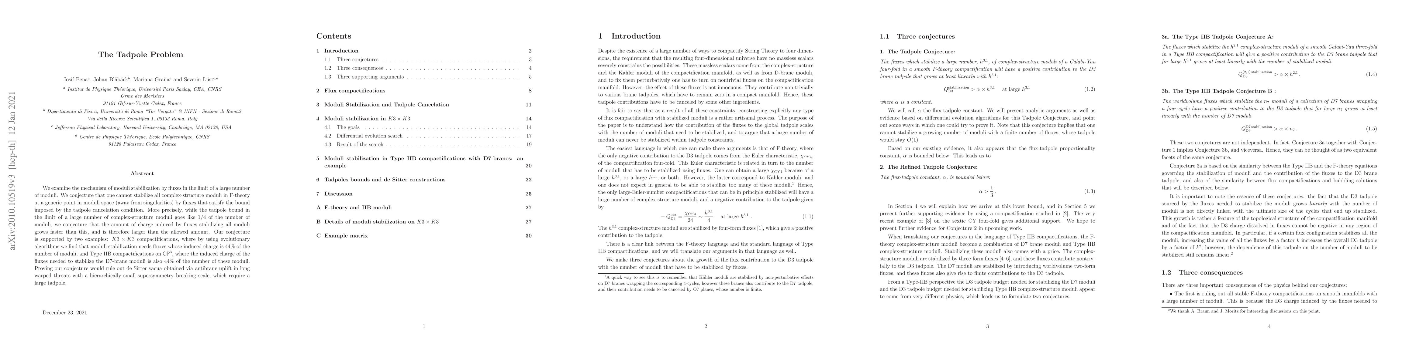 We examine the mechanism of moduli stabilization by fluxes in the limit of a large number of moduli. We conjecture that one cannot stabilize all complex-structure moduli in F-theory at a generic point in moduli space (away from singularities) by fluxes that satisfy the bound imposed by the tadpole cancelation condition. More precisely, while the tadpole bound in the limit of a large number of complex-structure moduli goes like 1/4 of the number of moduli, we conjecture that the amount of charge induced by fluxes stabilizing all moduli grows faster than this, and is therefore larger than the allowed amount. Our conjecture is supported by two examples: K3 x K3 compactifications, where by using evolutionary algorithms we find that moduli stabilization needs fluxes whose induced charge is 44% of the number of moduli, and Type IIB compactifications on CP^3, where the induced charge of the fluxes needed to stabilize the D7-brane moduli is also 44% of the number of these moduli. Proving our conjecture would rule out de Sitter vacua obtained via antibrane uplift in long warped throats with a hierarchically small supersymmetry breaking scale, which require a large tadpole.