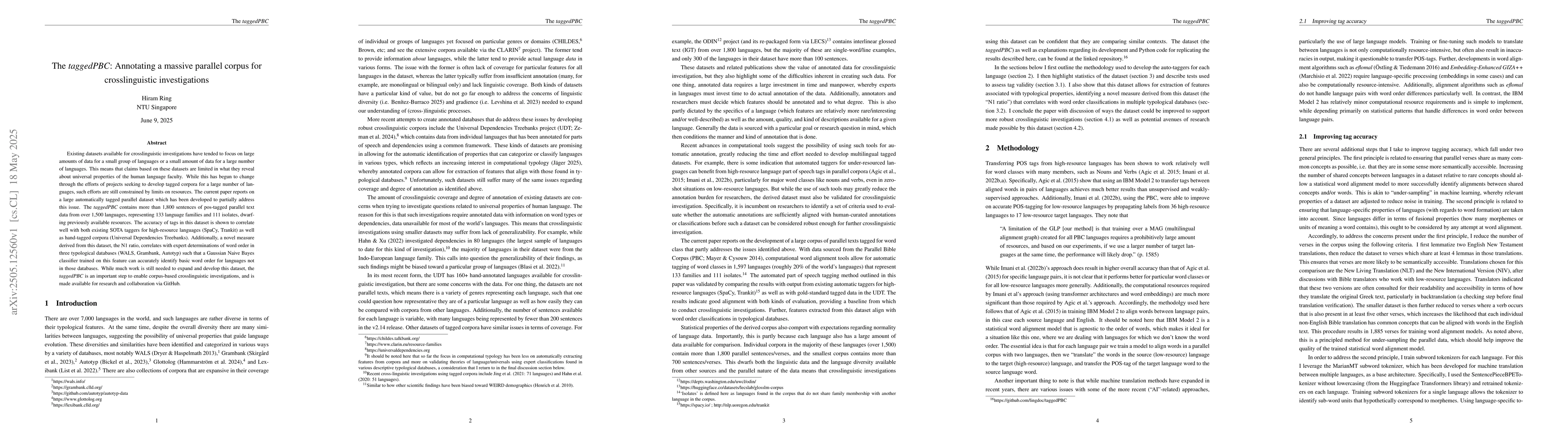 The research describes the creation of a large automatically tagged parallel corpus (taggedPBC) containing over 1,800 sentences of POS-tagged text from more than 1,500 languages, representing 133 language families and 111 isolates.