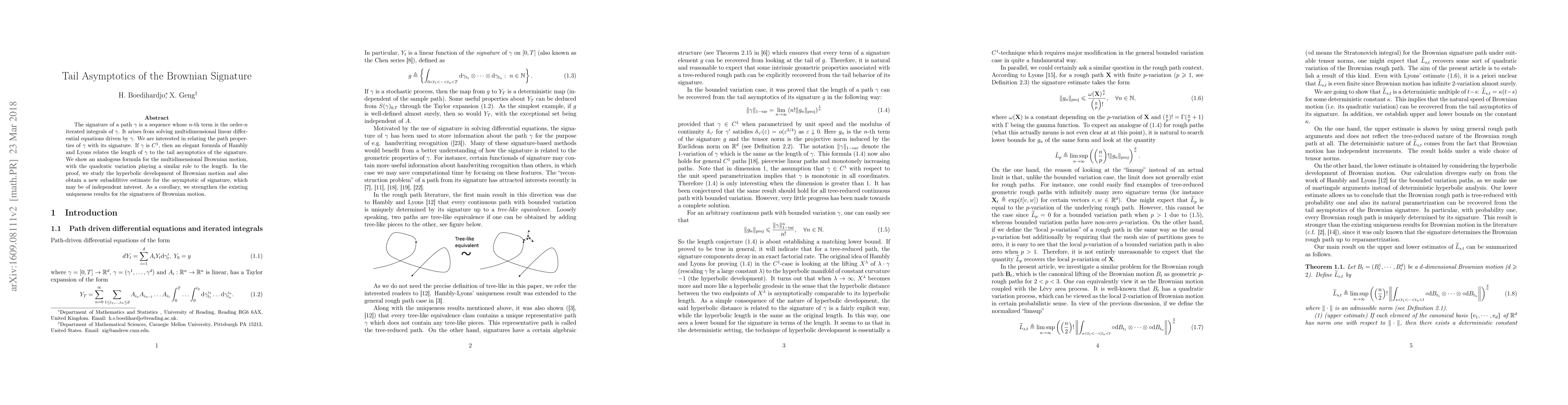 The signature of a path \gamma is a sequence whose n-th term is the order-n iterated integrals of \gamma. It arises from solving multidimensional linear differential equations driven by \gamma. We are interested in relating the path properties of \gamma with its signature. If \gamma is C^{1}, then an elegant formula of Hambly and Lyons relates the length of \gamma to the tail asymptotics of the signature. We show an analogous formula for the multidimensional Brownian motion, with the quadratic variation playing a similar role to the length. In the proof, we study the hyperbolic development of Brownian motion and also obtain a new subadditive estimate for the asymptotic of signature, which may be of independent interest. As a corollary, we strengthen the existing uniqueness results for the signatures of Brownian motion.