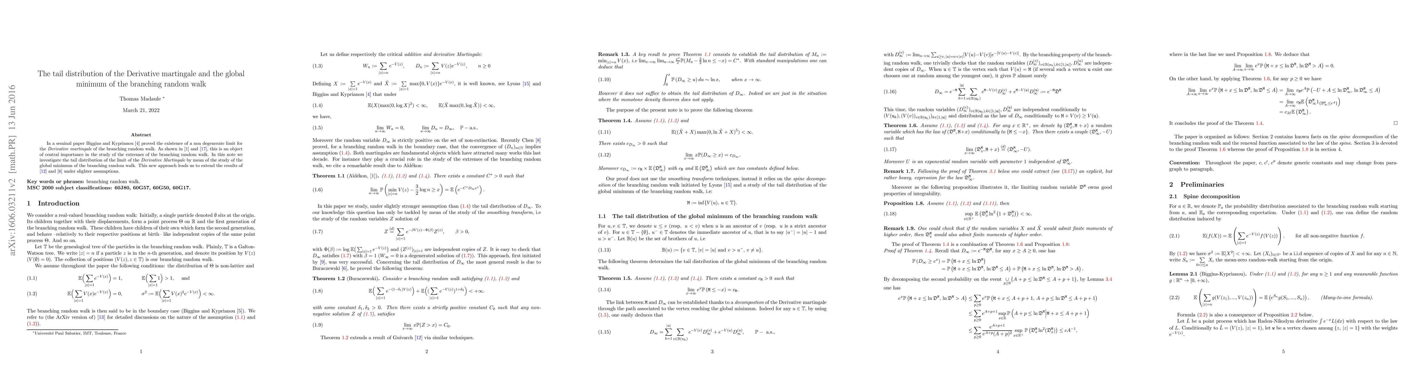 This paper investigates the tail distribution of the Derivative martingale limit of the branching random walk, utilizing the global minimum of the branching random walk for analysis. It extends previous results under milder assumptions.