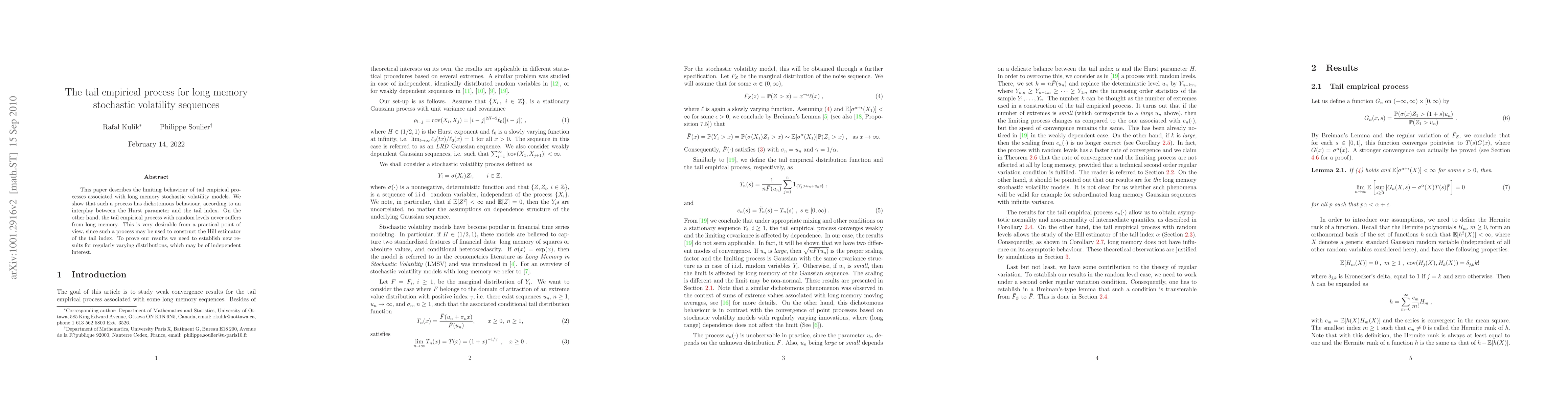 This paper investigates the limiting behavior of the tail empirical process for long memory stochastic volatility models, revealing dichotomous behavior influenced by the Hurst parameter and tail index. The findings indicate that long memory can lead to non-Gaussian or degenerate limits, while tail empirical processes with random levels remain unaffected, facilitating the construction of the Hill estimator for tail index.