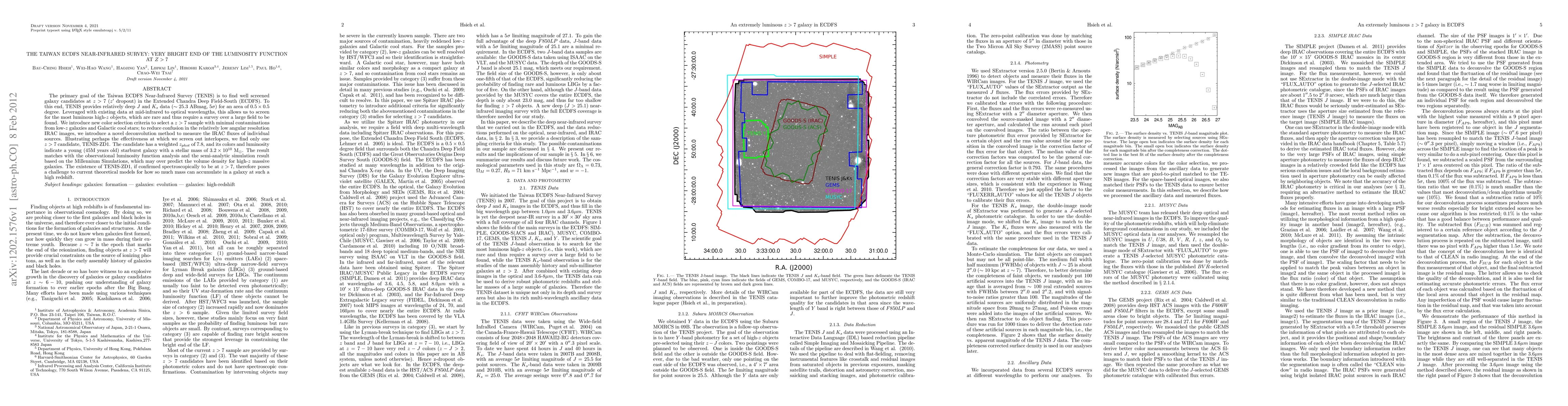 The primary goal of the Taiwan ECDFS Near-Infrared Survey (TENIS) is to find well screened galaxy candidates at z>7 (z' dropout) in the Extended Chandra Deep Field-South (ECDFS). To this end, TENIS provides relatively deep J and Ks data (~25.3 ABmag, 5-sigma) for an area of 0.5*0.5 degree. Leveraged with existing data at mid-infrared to optical wavelengths, this allows us to screen for the most luminous high-z objects, which are rare and thus require a survey over a large field to be found. We introduce new color selection criteria to select a z>7 sample with minimal contaminations from low-z galaxies and Galactic cool stars; to reduce confusion in the relatively low angular resolution IRAC images, we introduce a novel deconvolution method to measure the IRAC fluxes of individual sources. Illustrating perhaps the effectiveness at which we screen out interlopers, we find only one z>7 candidate, TENIS-ZD1. The candidate has a weighted z_phot of 7.8, and its colors and luminosity indicate a young (45M years old) starburst galaxy with a stellar mass of 3.2*10^10 M_sun. The result matches with the observational luminosity function analysis and the semi-analytic simulation result based on the Millennium Simulations, which may over predict the volume density for high-z massive galaxies. The existence of TENIS-ZD1, if confirmed spectroscopically to be at z>7, therefore poses a challenge to current theoretical models for how so much mass can accumulate in a galaxy at such a high redshift.