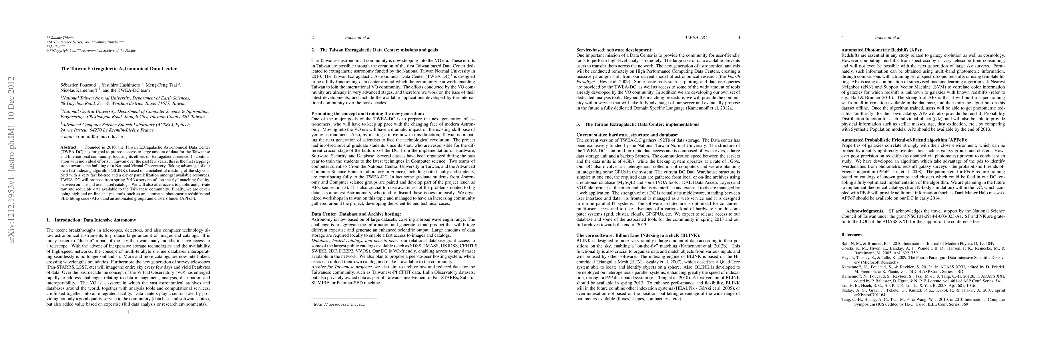 Founded in 2010, the Taiwan Extragalactic Astronomical Data Center (TWEA-DC) has for goal to propose access to large amount of data for the Taiwanese and International community, focusing its efforts on Extragalactic science. In continuation with individual efforts in Taiwan over the past few years, this is the first steppingstone towards the building of a National Virtual Observatory. Taking advantage of our own fast indexing algorithm (BLINK), based on a octahedral meshing of the sky coupled with a very fast kd-tree and a clever parallelization amongst available resources, TWEA-DC will propose from spring 2013 a service of "on-the-fly" matching facility, between on-site and user-based catalogs. We will also offer access to public and private raw and reducible data available to the Taiwanese community. Finally, we are developing high-end on-line analysis tools, such as an automated photometric redshifts and SED fitting code (APz), and an automated groups and clusters finder (APFoF).