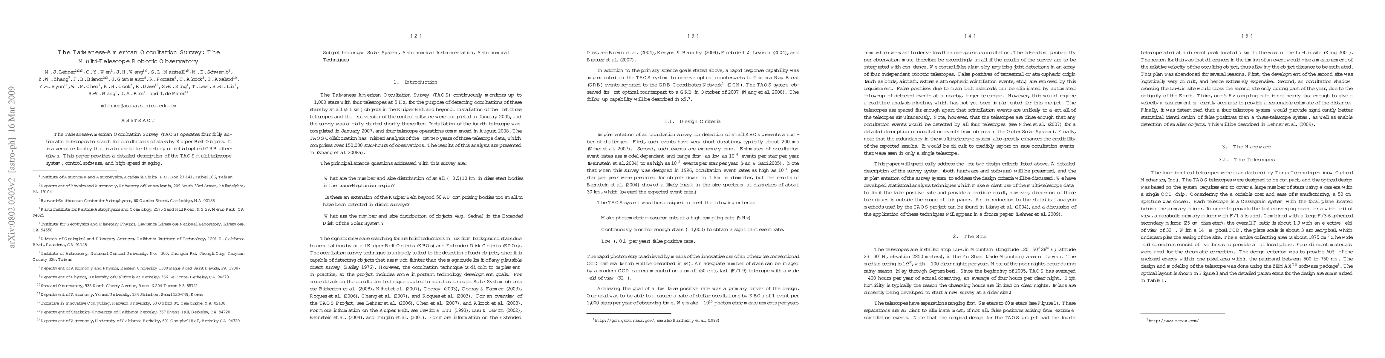 The Taiwanese-American Occultation Survey (TAOS) utilizes four automatic telescopes to detect occultations by Kuiper Belt Objects and initial optical GRB afterglows. The study details the multi-telescope robotic observatory system, its control software, and high-speed imaging capabilities.