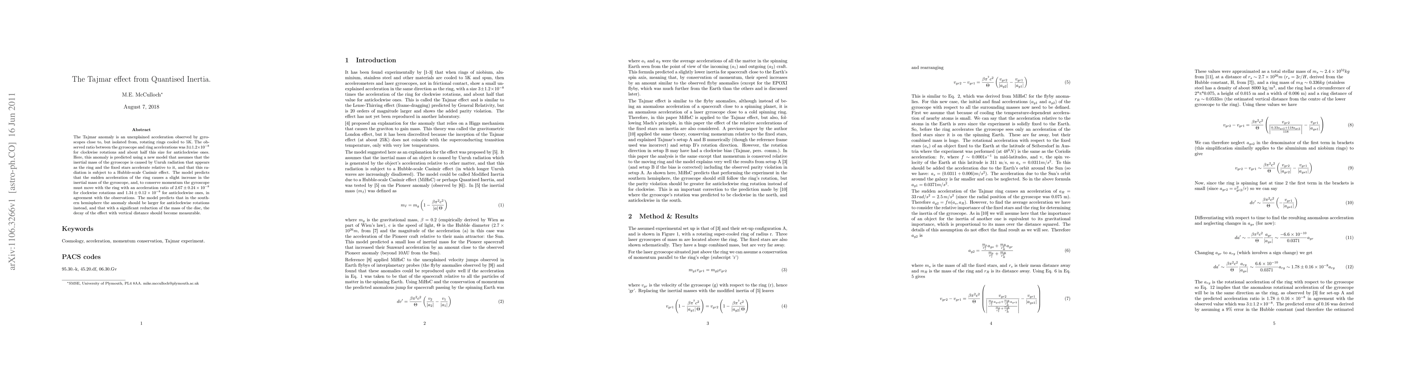 The Tajmar anomaly is an unexplained acceleration observed by gyroscopes close to, but isolated from, rotating rings cooled to 5K. The observed ratio between the gyroscope and ring accelerations was 3+/-1.2*10^-8 for clockwise rotations and about half this size for anticlockwise ones. Here, this anomaly is predicted using a new model that assumes that the inertial mass of the gyroscope is caused by Unruh radiation that appears as the ring and the fixed stars accelerate relative to it, and that this radiation is subject to a Hubble-scale Casimir effect. The model predicts that the sudden acceleration of the ring causes a slight increase in the inertial mass of the gyroscope, and, to conserve momentum the gyroscope must move with the ring with an acceleration ratio of 2.67+/-0.24*10^-8 for clockwise rotations and 1.34+/-0.12*10^-8 for anticlockwise ones, in agreement with the observations. The model predicts that in the southern hemisphere the anomaly should be larger for anticlockwise rotations instead, and that with a significant reduction of the mass of the disc, the decay of the effect with vertical distance should become measurable.