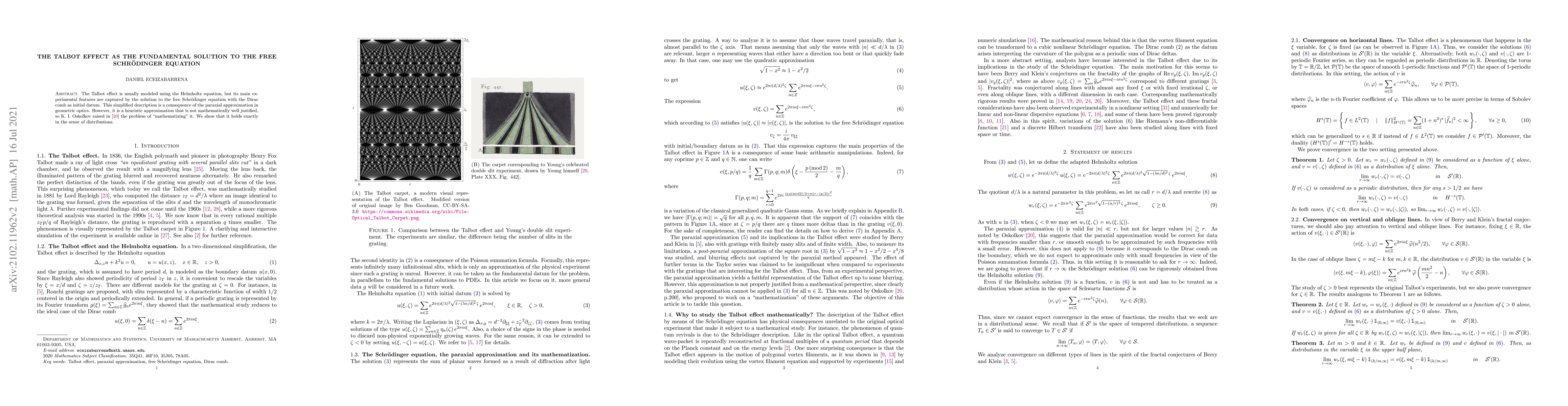 This research paper demonstrates that the Talbot effect, typically explained using the Helmholtz equation, can be accurately described by the free Schrödinger equation's solution with a Dirac comb initial condition. The study mathematically validates this simplified model, previously only a heuristic approximation, providing exact results in the sense of distributions.