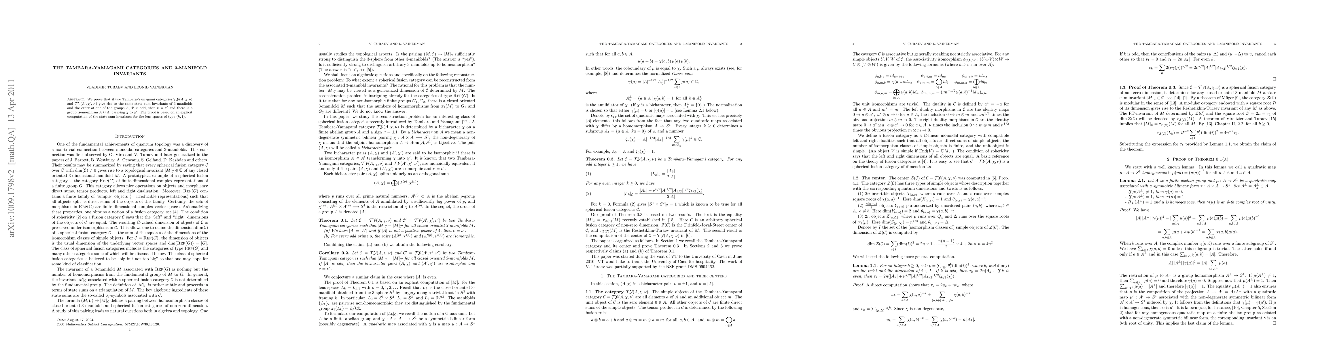 Summary: This paper proves that identical state sum invariants from Tambara-Yamagami categories for 3-manifolds imply the same group orders and group isomorphisms under certain conditions, based on explicit computations for lens spaces.