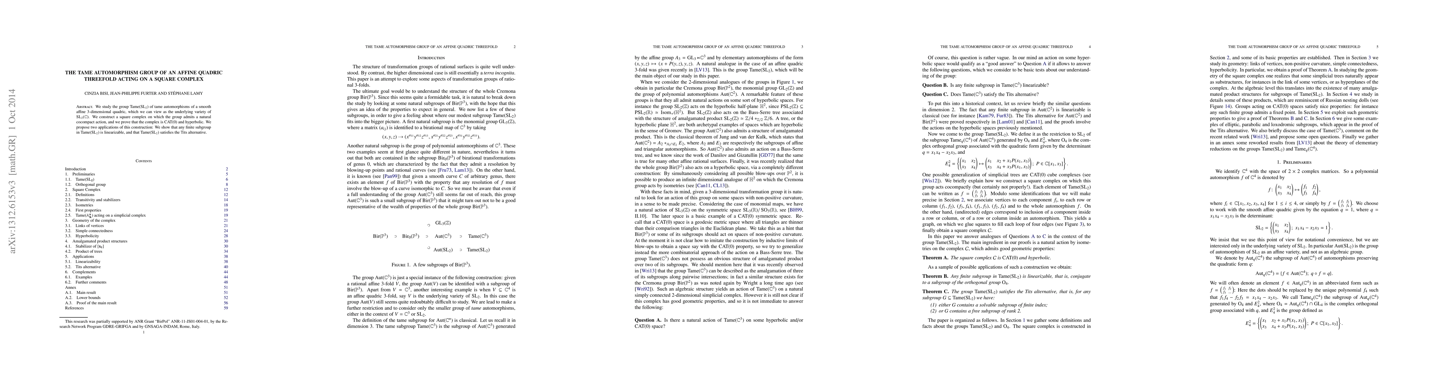 This paper investigates the tame automorphism group of a smooth affine 3-dimensional quadric, constructing a square complex on which this group acts cocompactly. The authors prove the complex is CAT(0) and hyperbolic, and demonstrate that any finite subgroup within this group is linearizable and that the group satisfies the Tits alternative.