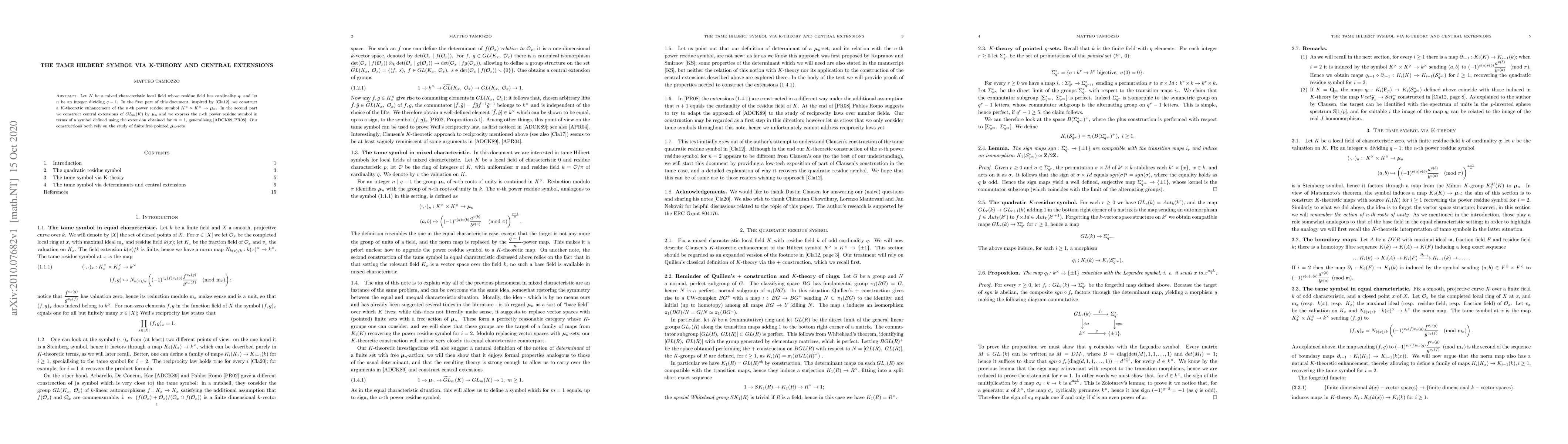 Let $K$ be a mixed characteristic local field whose residue field has cardinality $q$, and let $n$ be an integer dividing $q-1$. In the first part of this document we construct a $K$-theoretic enhancement of the $n$-th power residue symbol $K^\times \times K^\times \rightarrow \mu_n$. In the second part we construct central extensions of $GL_m(K)$ by $\mu_n$ and we express the $n$-th power residue symbol in terms of a symbol defined using the extension obtained for $m=1$. Our constructions both rely on the study of finite free pointed $\mu_n$-sets.