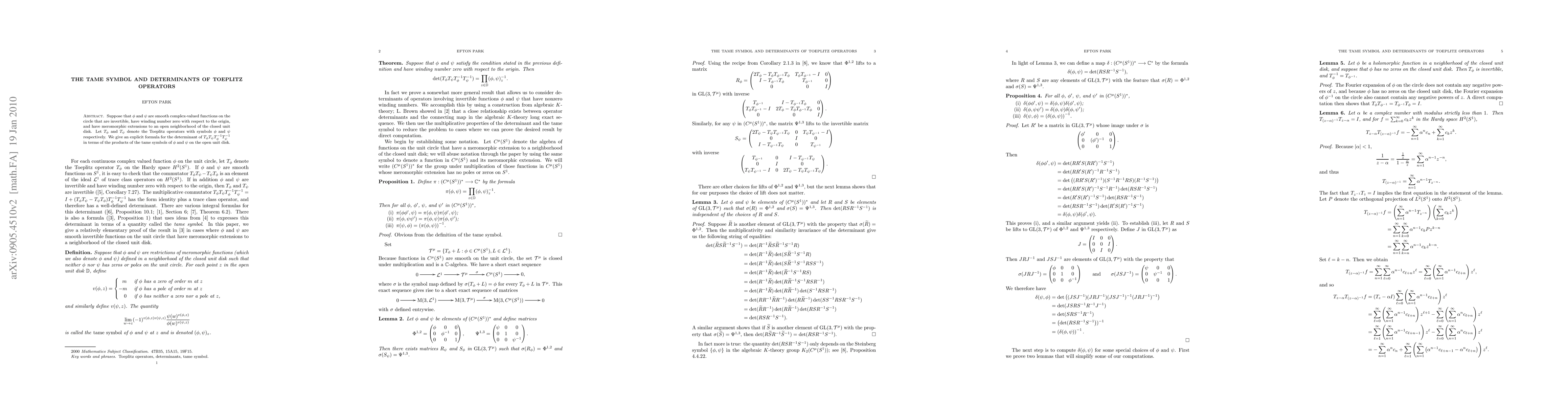 Suppose that $\phi$ and $\psi$ are smooth complex-valued functions on the circle that are invertible, have winding number zero with respect to the origin, and have meromorphic extensions to an open neighborhood of the closed unit disk. Let $T_\phi$ and $T_\psi$ denote the Toeplitz operators with symbols $\phi$ and $\psi$ respectively. We give an explicit formula for the determinant of $T_\phi T_\psi T_\phi^{-1} T_\psi^{-1}$ in terms of the products of the tame symbols of $\phi$ and $\psi$ on the open unit disk.