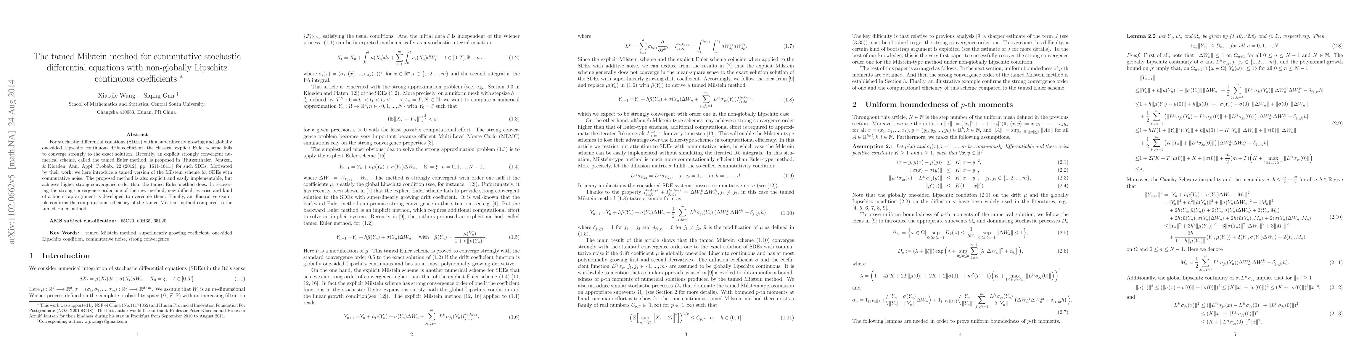This paper introduces a tamed version of the Milstein method for solving SDEs with commutative noise and non-globally Lipschitz continuous coefficients, achieving higher strong convergence order than the tamed Euler method. The method employs a bootstrap argument to address new convergence difficulties.