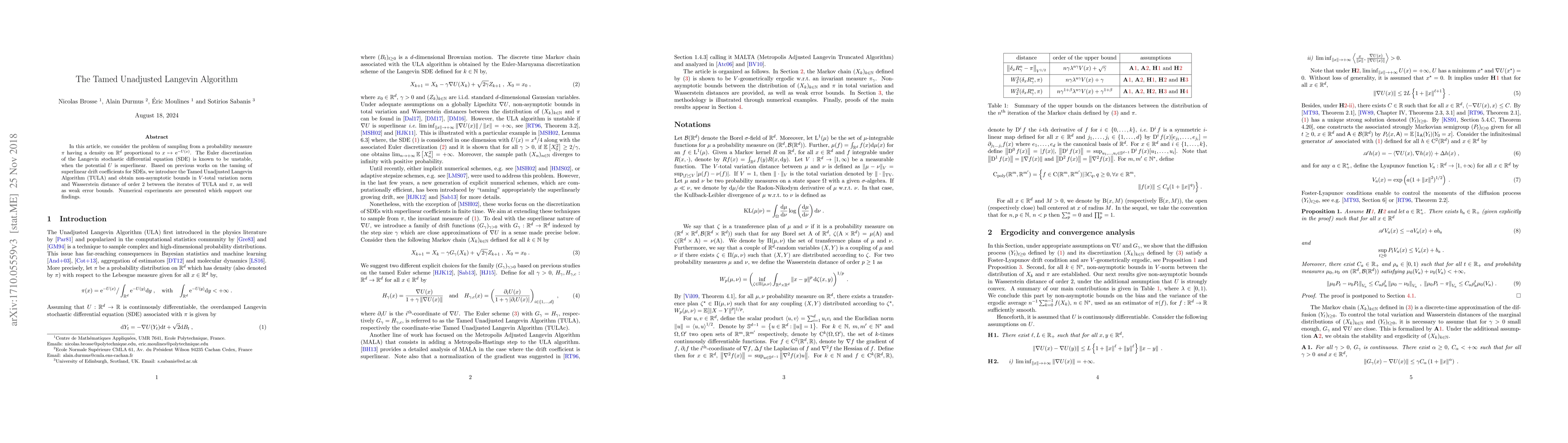 This paper introduces the Tamed Unadjusted Langevin Algorithm (TULA) to sample from probability measures with superlinear potentials, providing non-asymptotic bounds and weak error bounds. Numerical experiments validate the effectiveness of TULA in stabilizing the Langevin SDE.