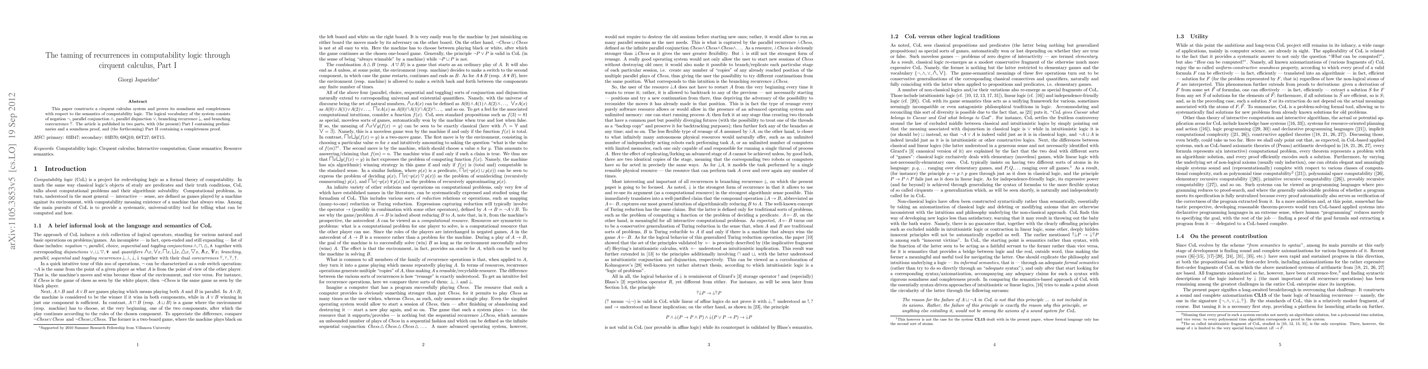 This paper constructs a cirquent calculus system and proves its soundness and completeness with respect to the semantics of computability logic (see http://www.cis.upenn.edu/~giorgi/cl.html). The logical vocabulary of the system consists of negation, parallel conjunction, parallel disjunction, branching recurrence, and branching corecurrence. The article is published in two parts, with (the present) Part I containing preliminaries and a soundness proof, and (the forthcoming) Part II containing a completeness proof.