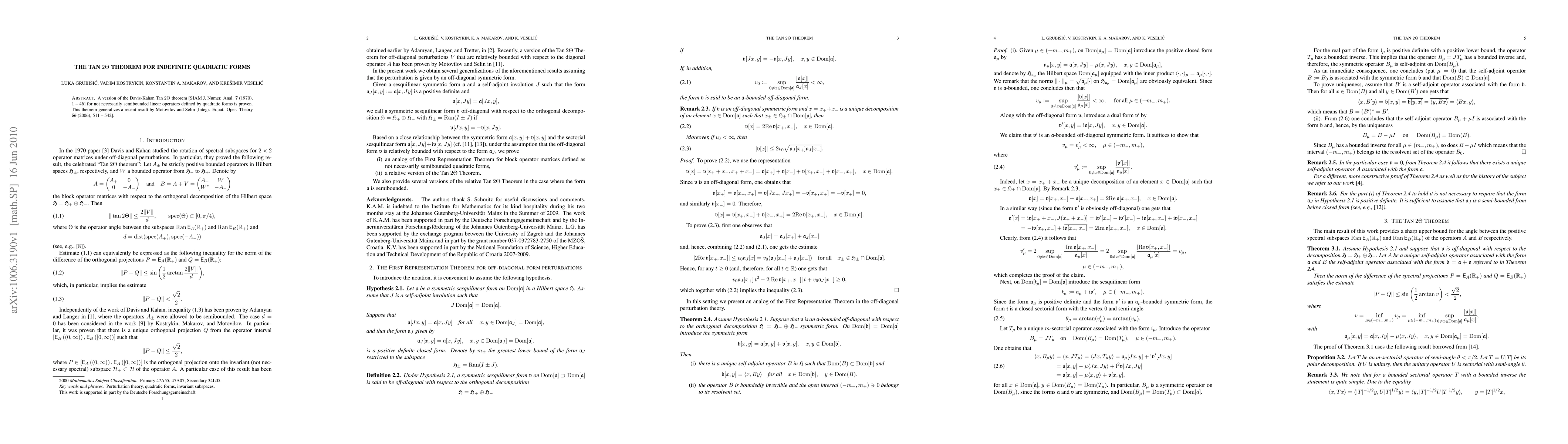 The paper proves a generalized version of the Davis-Kahan Tan $2\Theta$ theorem for indefinite quadratic forms, extending the result to not necessarily semibounded linear operators. This extends the work of Motovilov and Selin from a bounded context to a more general setting.