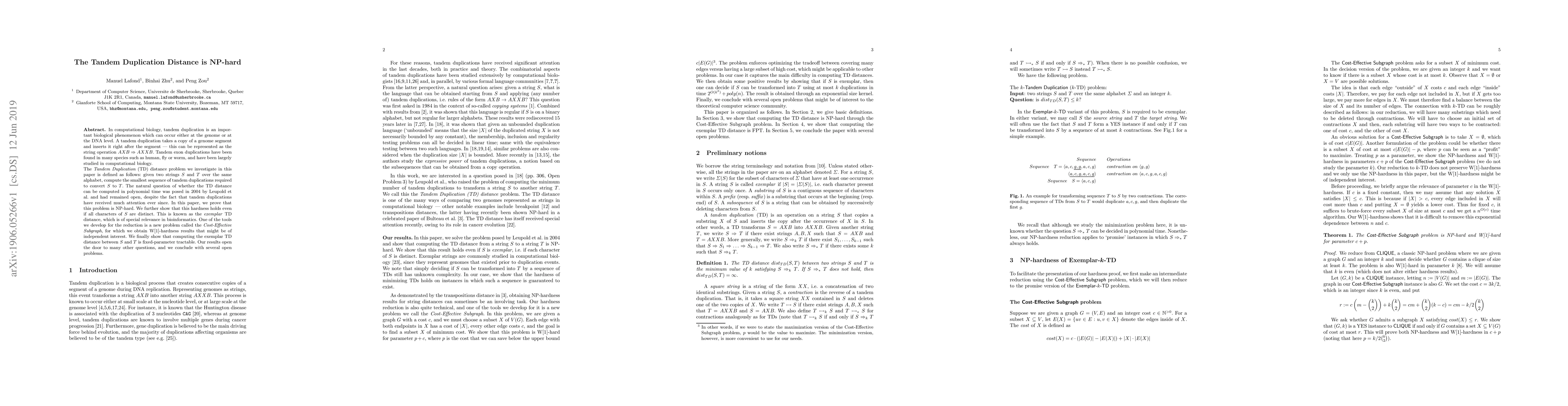 In computational biology, tandem duplication is an important biological phenomenon which can occur either at the genome or at the DNA level. A tandem duplication takes a copy of a genome segment and inserts it right after the segment - this can be represented as the string operation $AXB \Rightarrow AXXB$. For example, Tandem exon duplications have been found in many species such as human, fly or worm, and have been largely studied in computational biology. The Tandem Duplication (TD) distance problem we investigate in this paper is defined as follows: given two strings $S$ and $T$ over the same alphabet, compute the smallest sequence of tandem duplications required to convert $S$ to $T$. The natural question of whether the TD distance can be computed in polynomial time was posed in 2004 by Leupold et al. and had remained open, despite the fact that tandem duplications have received much attention ever since. In this paper, we prove that this problem is NP-hard. We further show that this hardness holds even if all characters of $S$ are distinct. This is known as the exemplar TD distance, which is of special relevance in bioinformatics. One of the tools we develop for the reduction is a new problem called the Cost-Effective Subgraph, for which we obtain W[1]-hardness results that might be of independent interest. We finally show that computing the exemplar TD distance between $S$ and $T$ is fixed-parameter tractable. Our results open the door to many other questions, and we conclude with several open problems.