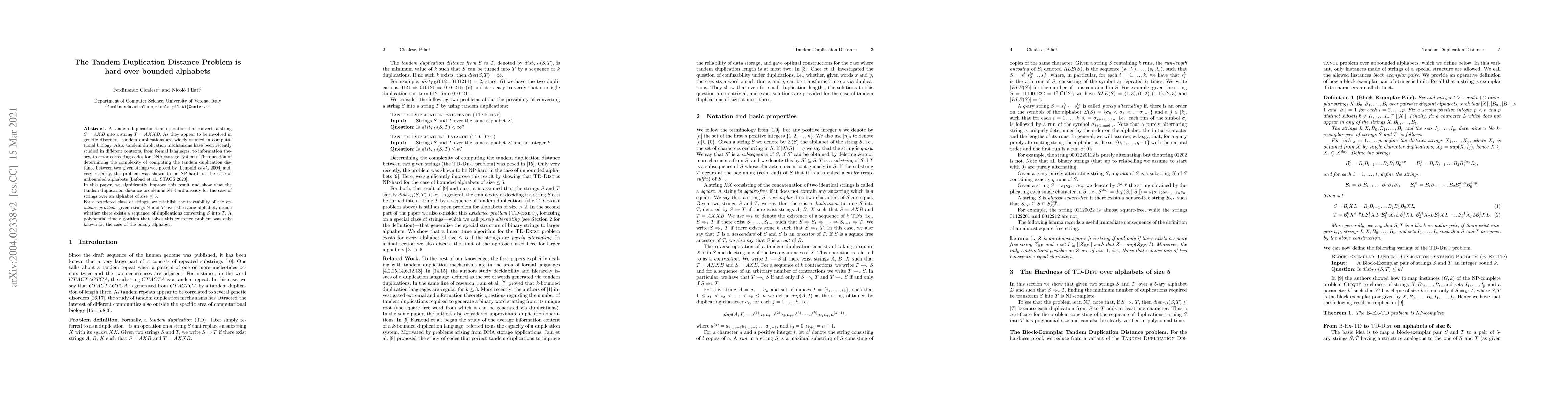 A tandem duplication denotes the process of inserting a copy of a segment of DNA adjacent to its original position. More formally, a tandem duplication can be thought of as an operation that converts a string $S = AXB$ into a string $T = AXXB.$ As they appear to be involved in genetic disorders, tandem duplications are widely studied in computational biology. Also, tandem duplication mechanisms have been recently studied in different contexts, from formal languages, to information theory, to error-correcting codes for DNA storage systems. The problem of determining the complexity of computing the tandem duplication distance between two given strings was proposed by [Leupold et al., 2004] and, very recently, it was shown to be NP-hard for the case of unbounded alphabets [Lafond et al., STACS2020]. In this paper, we significantly improve this result and show that the tandem duplication distance problem is NP-hard already for the case of strings over an alphabet of size $\leq 5.$ We also study some special classes of strings were it is possible to give linear time solutions to the existence problem: given strings $S$ and $T$ over the same alphabet, decide whether there exists a sequence of duplications converting $S$ into $T$. A polynomial time algorithm that solves the existence problem was only known for the case of the binary alphabet.