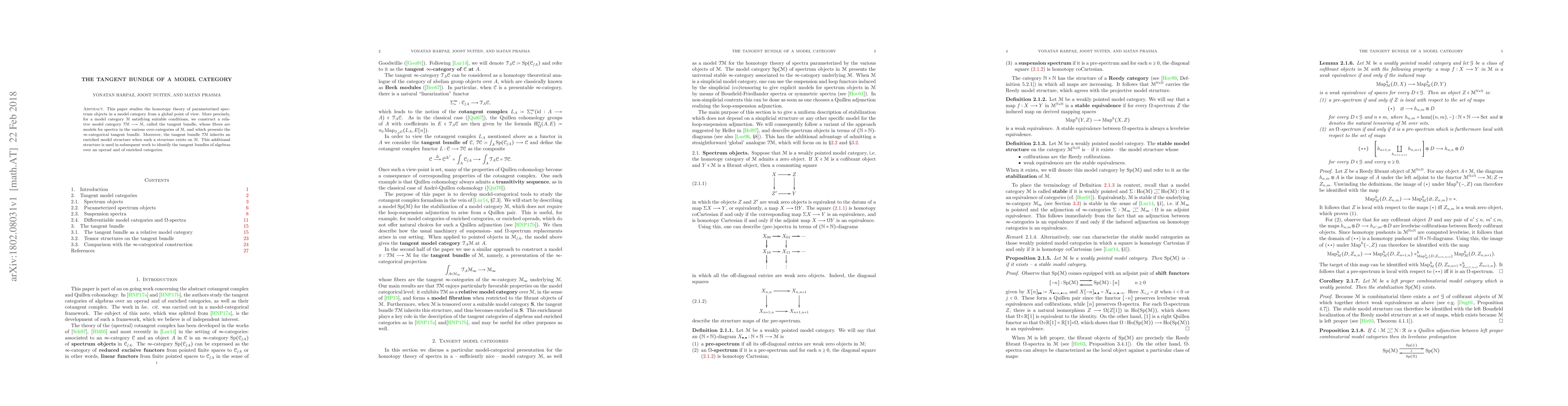 This paper studies the homotopy theory of parameterized spectrum objects in a model category from a global point of view. More precisely, for a model category $\mathcal{M}$ satisfying suitable conditions, we construct a relative model category $\mathcal{TM} \to \mathcal{M}$, called the tangent bundle, whose fibers are models for spectra in the various over-categories of $\mathcal{M}$, and which presents the $\infty$-categorical tangent bundle. Moreover, the tangent bundle $\mathcal{TM}$ inherits an enriched model structure when such a structure exists on $\mathcal{M}$. This additional structure is used in subsequent work to identify the tangent bundles of algebras over an operad and of enriched categories.