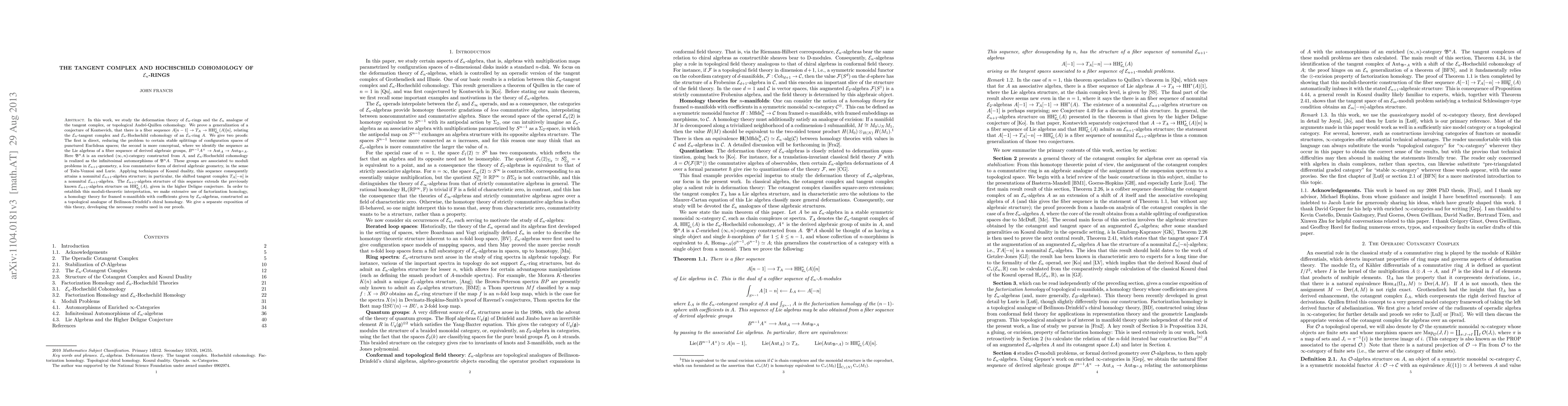 In this work, we study the deformation theory of $\cE_n$-rings and the $\cE_n$ analogue of the tangent complex, or topological Andr\'e-Quillen cohomology. We prove a generalization of a conjecture of Kontsevich, that there is a fiber sequence $A[n-1] \ra T_A\ra \hh^*_{\cE_{n}}(A)[n]$, relating the $\cE_n$-tangent complex and $\cE_n$-Hochschild cohomology of an $\cE_n$-ring $A$. We give two proofs: The first is direct, reducing the problem to certain stable splittings of configuration spaces of punctured Euclidean spaces; the second is more conceptual, where we identify the sequence as the Lie algebras of a fiber sequence of derived algebraic groups, $B^{n-1}A^\times\ra \Aut_A\ra \Aut_{\fB^nA}$. Here $\fB^nA$ is an enriched $(\oo,n)$-category constructed from $A$, and $\cE_n$-Hochschild cohomology is realized as the infinitesimal automorphisms of $\fB^nA$. These groups are associated to moduli problems in $\cE_{n+1}$-geometry, a {\it less} commutative form of derived algebraic geometry, in the sense of To\"en-Vezzosi and Lurie. Applying techniques of Koszul duality, this sequence consequently attains a nonunital $\cE_{n+1}$-algebra structure; in particular, the shifted tangent complex $T_A[-n]$ is a nonunital $\cE_{n+1}$-algebra. The $\cE_{n+1}$-algebra structure of this sequence extends the previously known $\cE_{n+1}$-algebra structure on $\hh^*_{\cE_{n}}(A)$, given in the higher Deligne conjecture. In order to establish this moduli-theoretic interpretation, we make extensive use of factorization homology, a homology theory for framed $n$-manifolds with coefficients given by $\cE_n$-algebras, constructed as a topological analogue of Beilinson-Drinfeld's chiral homology. We give a separate exposition of this theory, developing the necessary results used in our proofs. This work is an elaboration of a chapter of the author's 2008 PhD thesis, \cite{thez}.