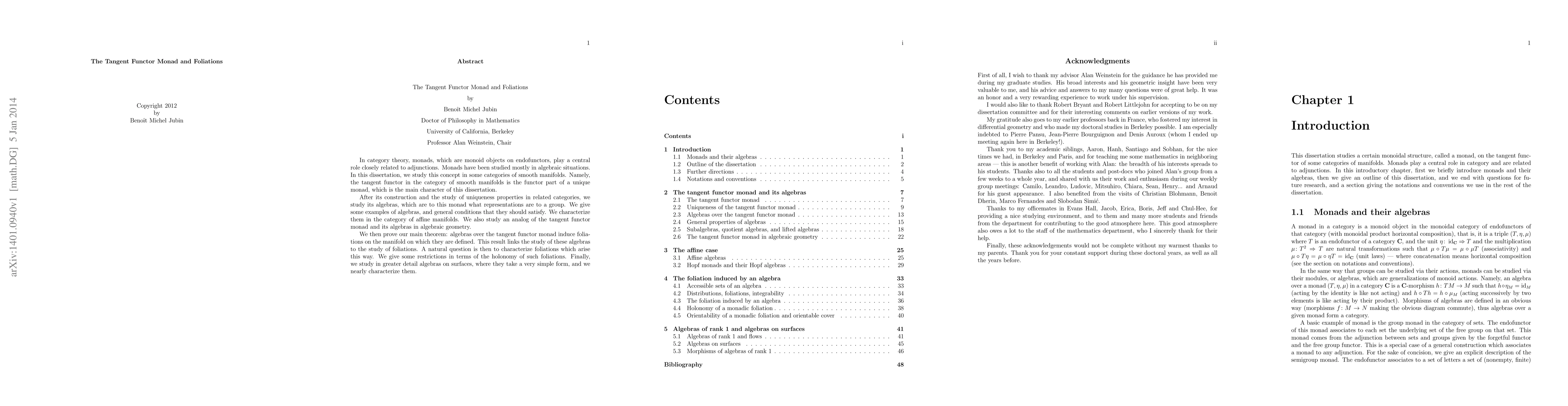 In category theory, monads, which are monoid objects on endofunctors, play a central role closely related to adjunctions. Monads have been studied mostly in algebraic situations. In this dissertation, we study this concept in some categories of smooth manifolds. Namely, the tangent functor in the category of smooth manifolds is the functor part of a unique monad, which is the main character of this dissertation. After its construction and the study of uniqueness properties in related categories, we study its algebras, which are to this monad what representations are to a group. We give some examples of algebras, and general conditions that they should satisfy. We characterize them in the category of affine manifolds. We also study an analog of the tangent functor monad and its algebras in algebraic geometry. We then prove our main theorem: algebras over the tangent functor monad induce foliations on the manifold on which they are defined. This result links the study of these algebras to the study of foliations. A natural question is then to characterize foliations which arise this way. We give some restrictions in terms of the holonomy of such foliations. Finally, we study in greater detail algebras on surfaces, where they take a very simple form, and we nearly characterize them.